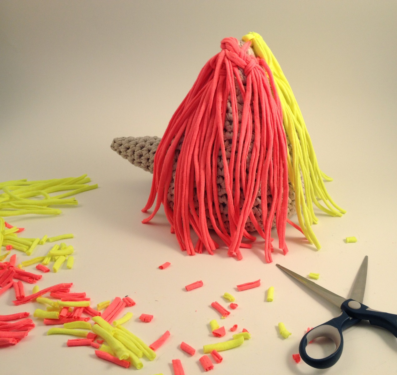 Restgarn till hår i valfritt garn och färg (vi har valt Zpagetti i neonfärger)