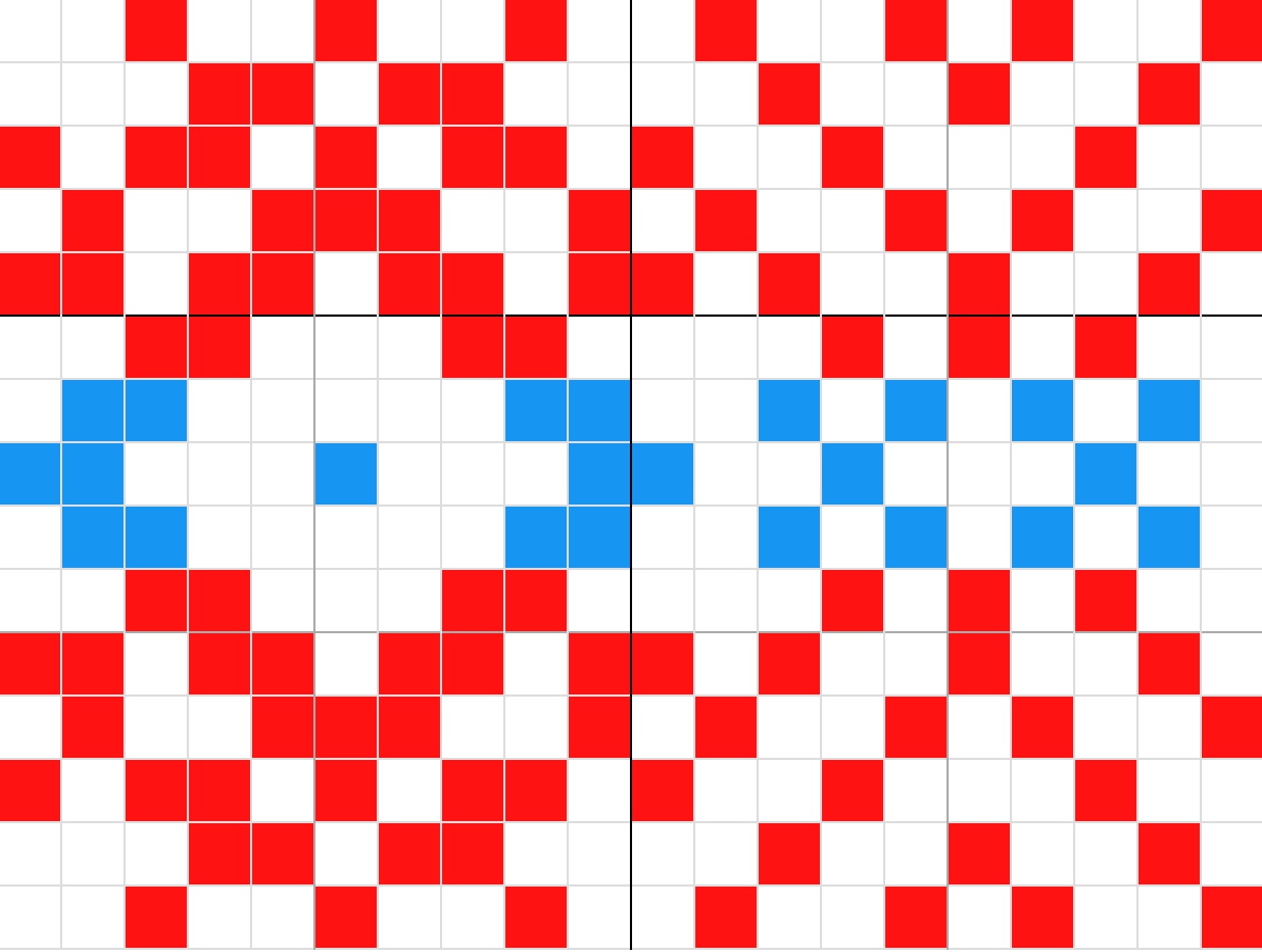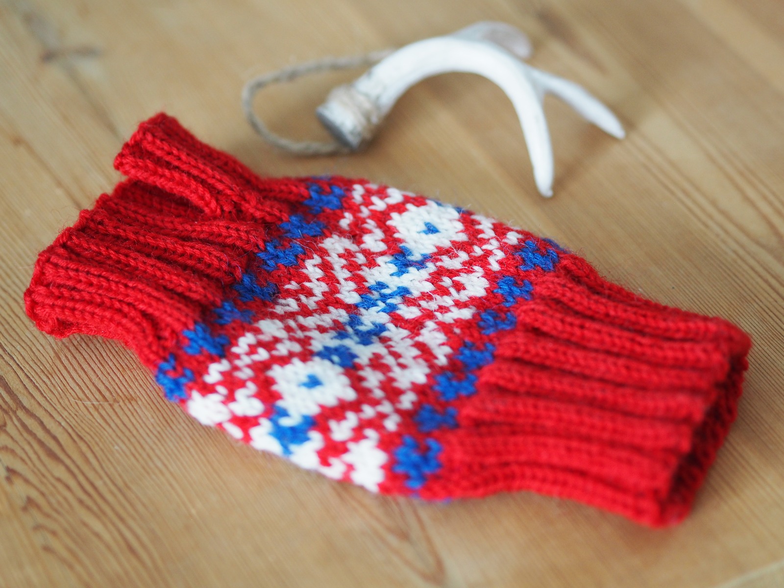 Material: 50 gram röd Mellanraggi, rester av blå och vit Mellanraggi, strumpstickor 3 mm.