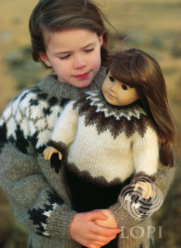 Docktröjans färger: natur (10051), beige (10085), mellanbrun (10053), svartbrun (10052). Mönster till flickans tröja finns i Lopi bok nr 18.