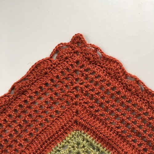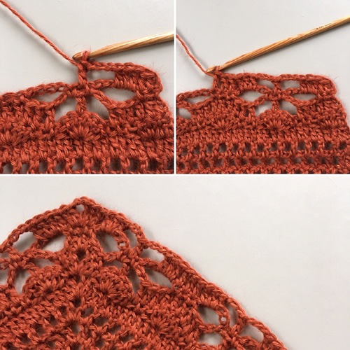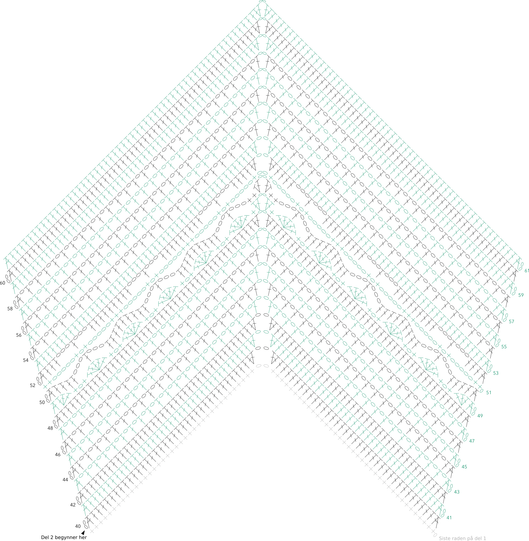2 lm, 2 st sm i de første 2 m, 3 st i neste m, *ho 2 m, 1 fm i neste m, 1 lm, ho 1 m, 1 fm i neste m, ho 2 m, 5 st i neste m*, gjenta *-* 4 ggr til. Ho 2 m, 1 fm i neste m, (2 st, 2 lm, 2 st) i m-lmb, 1 fm i neste m, *ho 2 m, 5 st i neste m, ho 2 m, 1 fm i neste m, 1 lm, ho 1 m, 1 fm i neste m* gjenta *-* 4 ggr til. Ho 2 m, 3 st i neste m, 2 st sm i de siste 2 m.