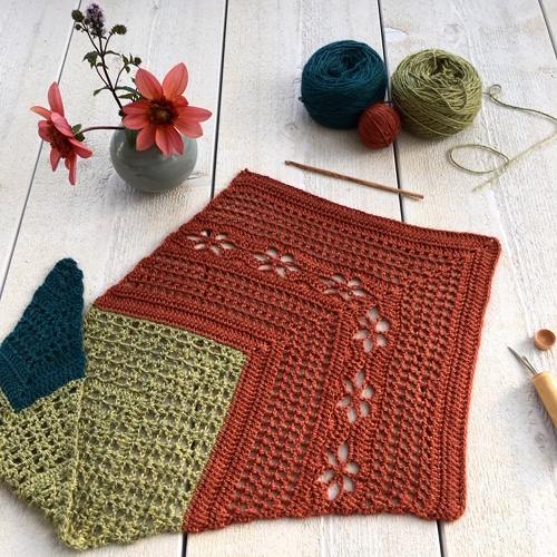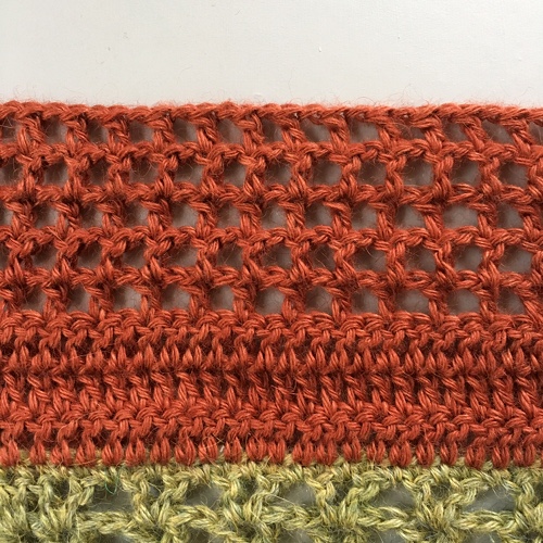 1 st i neste m, *3 st i neste 5-lmb, 3 lm, ho 1 m, 1 st i neste 1-lmb, 3 lm, ho 1 m, 3 st i neste 5-lmb,
