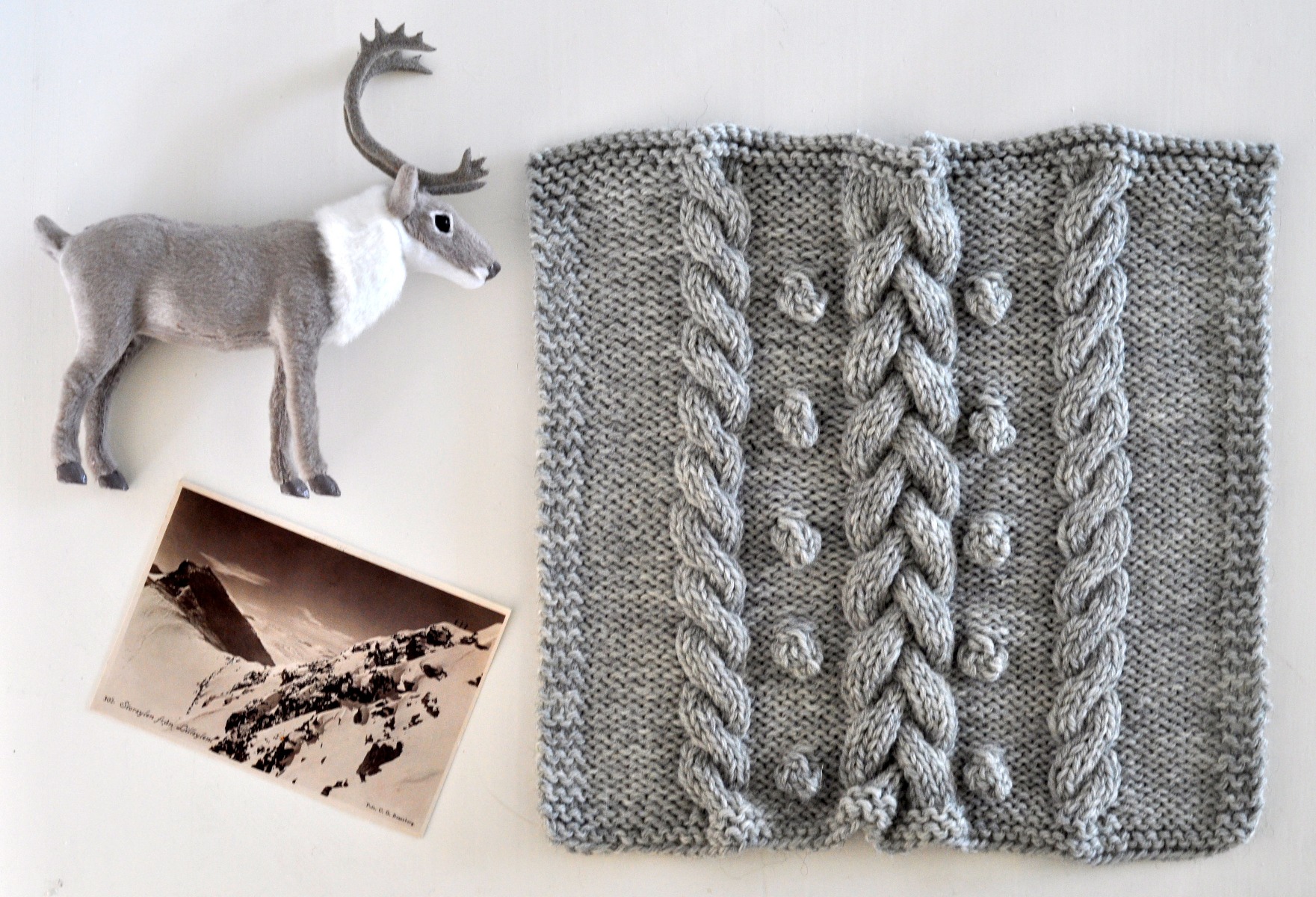 ”Fjällstuga” ger dig möjlighet att prova på två olika tekniker: Flätstickning och muscher.