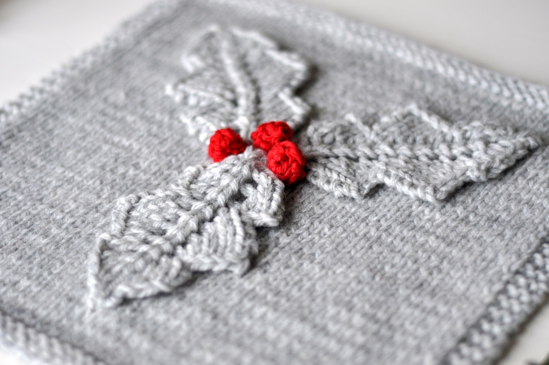 Veckans ruta består av en slätstickad bas som sedan dekoreras med blad och bär som stickas separat och sys på rutan – en slags stickade applikationer alltså!