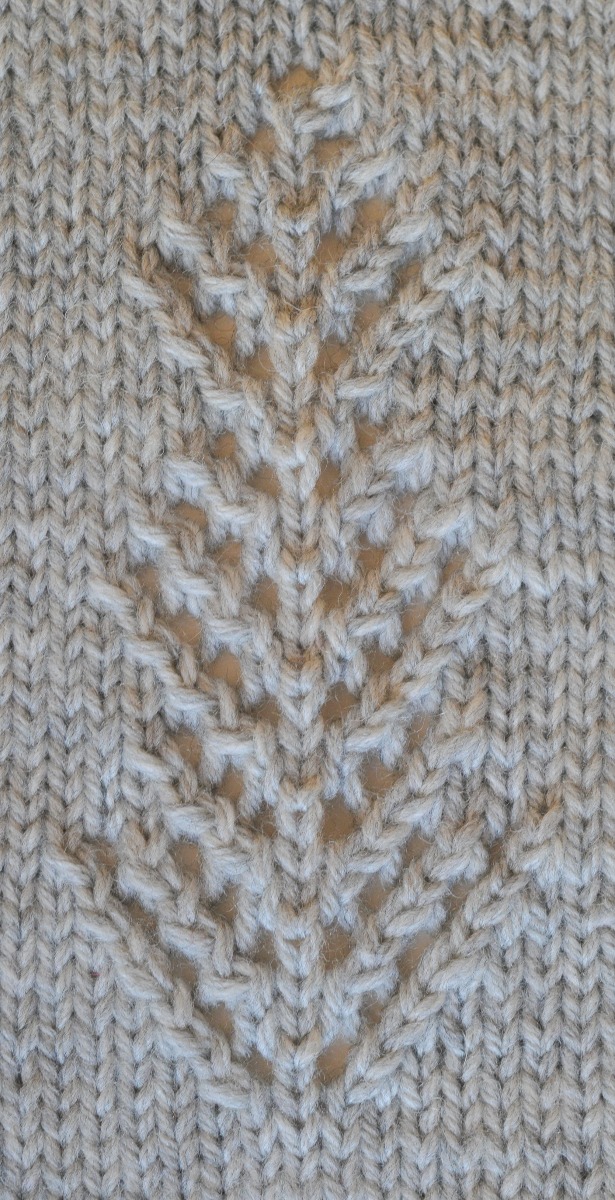 Veckans ruta består av ett enkelt hålmönster på slätstickad botten. Är du inte bekant med spetsstickning sedan tidigare så kan julgransmönstret fungera som en bra introduktion. För att kunna sticka det måste du lära dig bemästra omslag och två olika typer av minskningar: Dels ”2 rm tillsammans” som ger en minskning med högerlutning och dels ”överdragshoptagning” – en alternativ minskning med vänsterlutning. Det är inte så svårt som det låter!