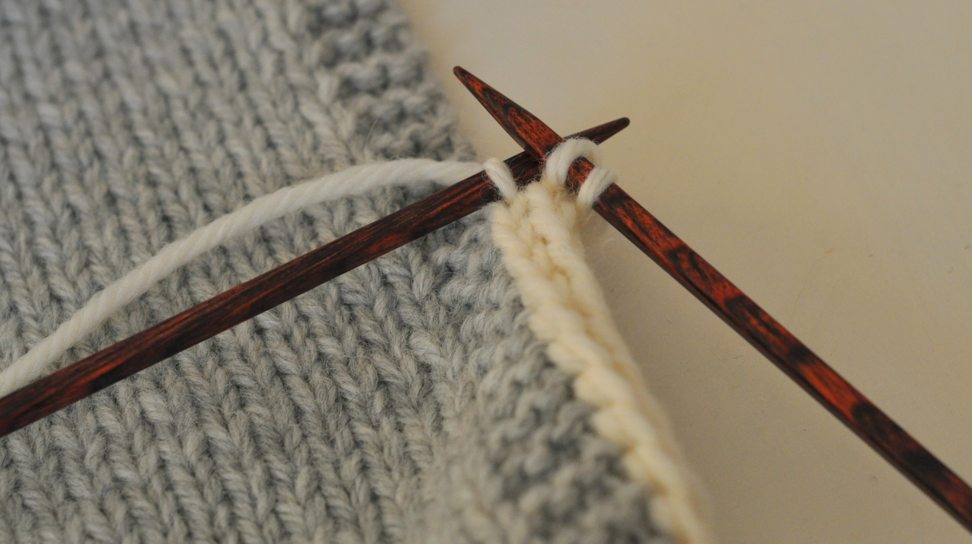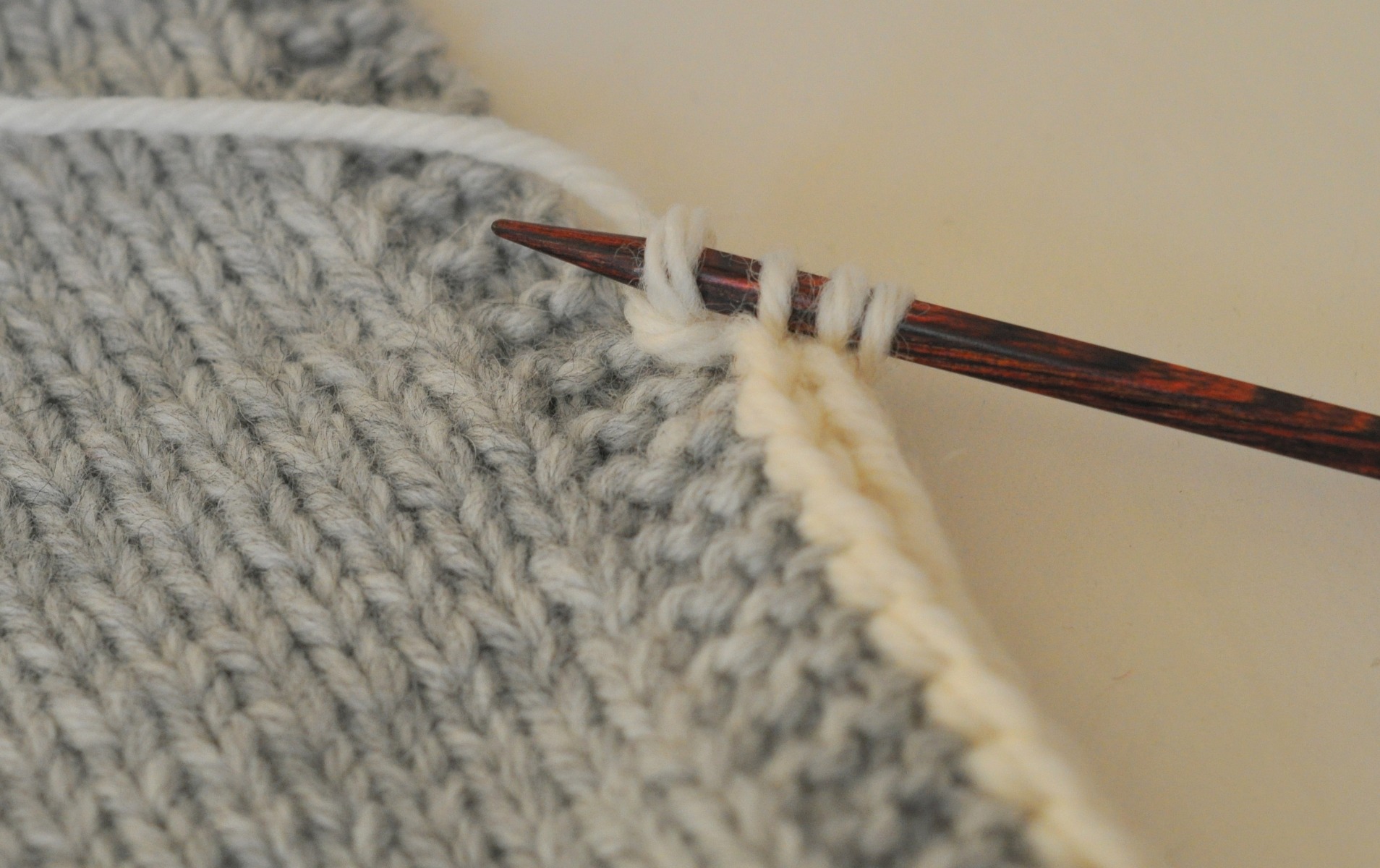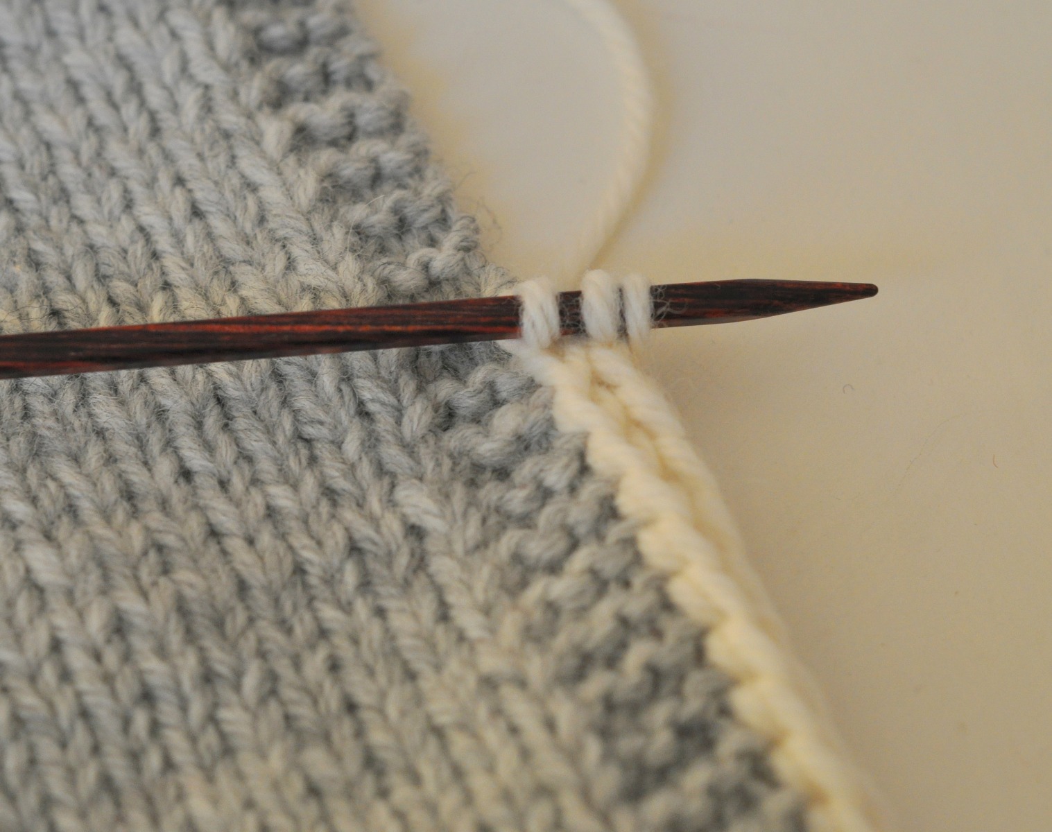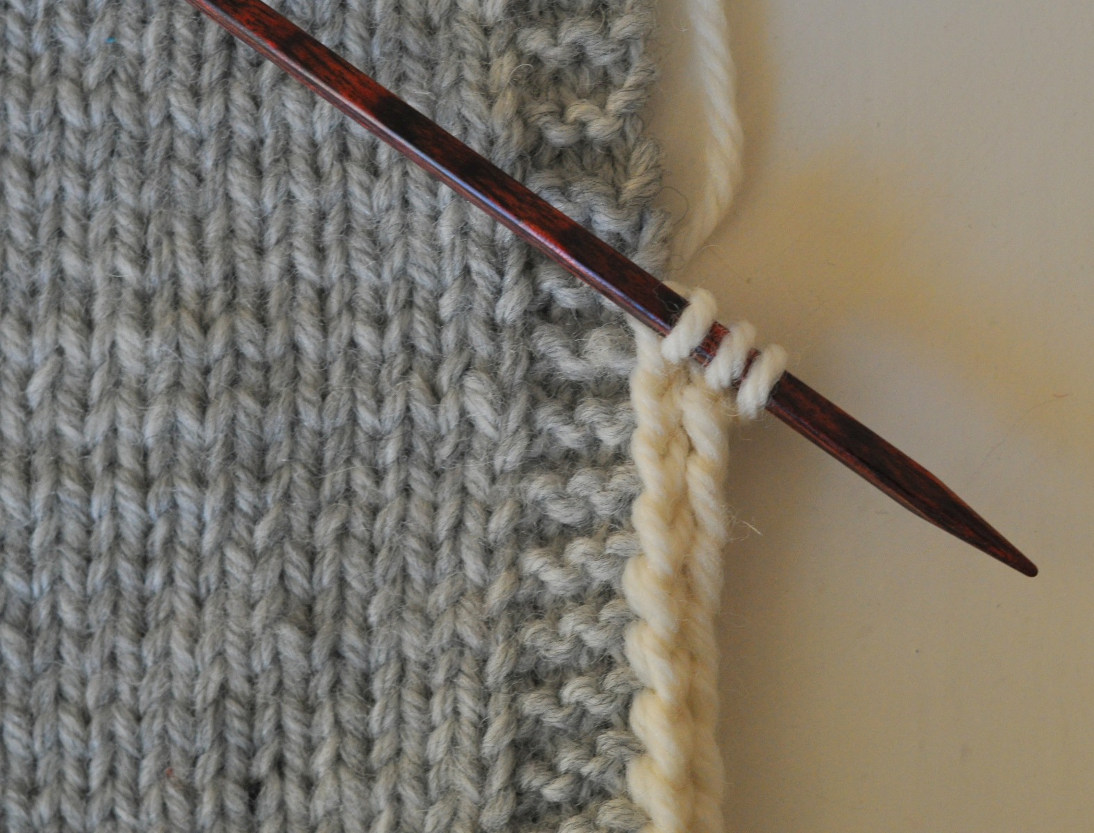 Börja så här: Lägg upp 3 m, skjut stickningen till höger sida av stickan utan att vända arbetet, (du har då det lösa trådarna på arbetets vänstra sida), sticka 2 rm, lyft nästa m som om du skulle sticka den avigt, gör 1 omslag.
