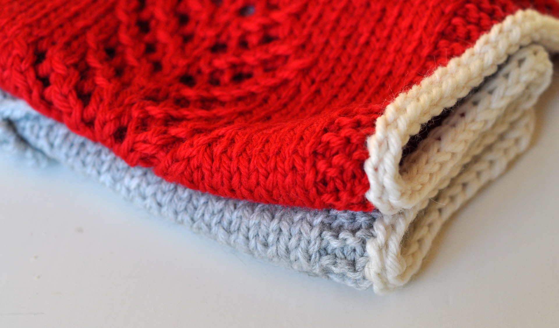 Du behöver rester av röd, vit, eller grå Raggi och 2 strumpstickor nr 5.