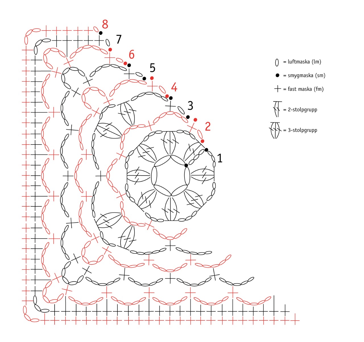 *[1 fm, 5 lm, 1 fm] i nästa 3-lmb (= hörn), 5 lm, (1 fm i nästa 5-lmb, 5 lm) 2 ggr*, upprepa *-* ytterligare 2 ggr,