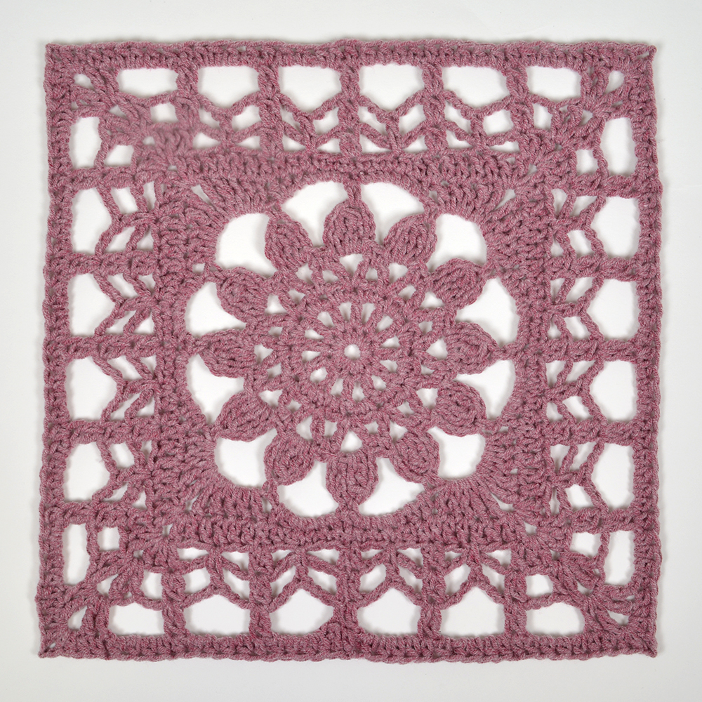 Varv 10: 2 lm, 1 st i den hopv st, 3 lm, 1 st med nedtag i mittersta av de överhoppade 5 m på v 8 (låt 6-lm-kedjan från varv 9 virkas in), 3 lm, 2 hopv st i nästa hopv st, 3 lm, 1 st i den mittersta m på v 8, 3 lm, 2 hopv st i nästa st, 3 lm, hoppa över 2 st, [1 st, 1 dst, 1 lm, 1 dst, 1 st] om hörnets lm, 3 lm, hoppa över 2 st, 2 hopv st i nästa st,