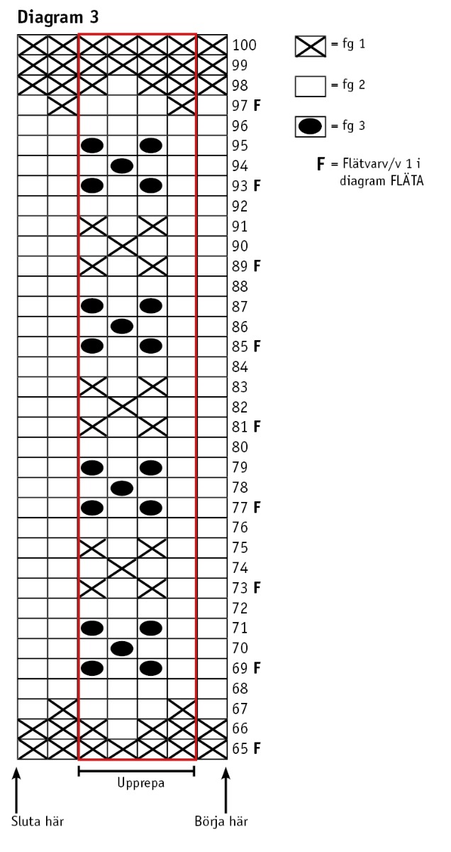 Sticka enligt diagram 3, varv 65-100. Fortsätt hela tiden med flätan, men nu blir det också lite mer att tänka på. Sockskaftet behöver bli smalare och det gör vi med intagningar. Dessa görs baktill, på var sida om flätan. Var och hur tätt anges för respektive storlek nedan. Se noga ut vad som gäller för din skaftstorlek och skostorlek.