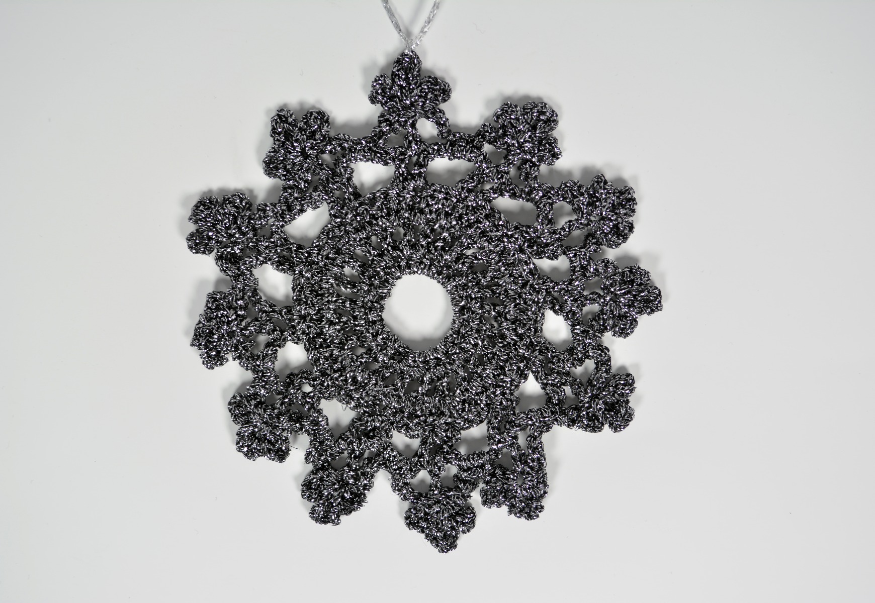 Lägg med Glittra (svart/silver, 18103) och virknål nr 3.5 upp 12 lm, slut dem till en ring med 1 sm.