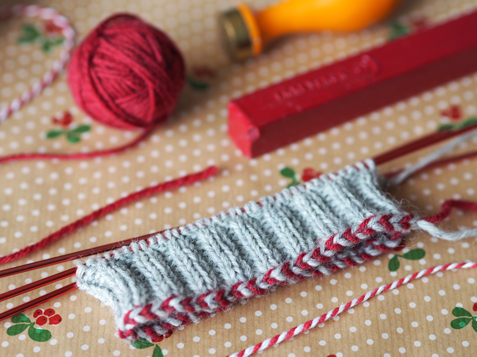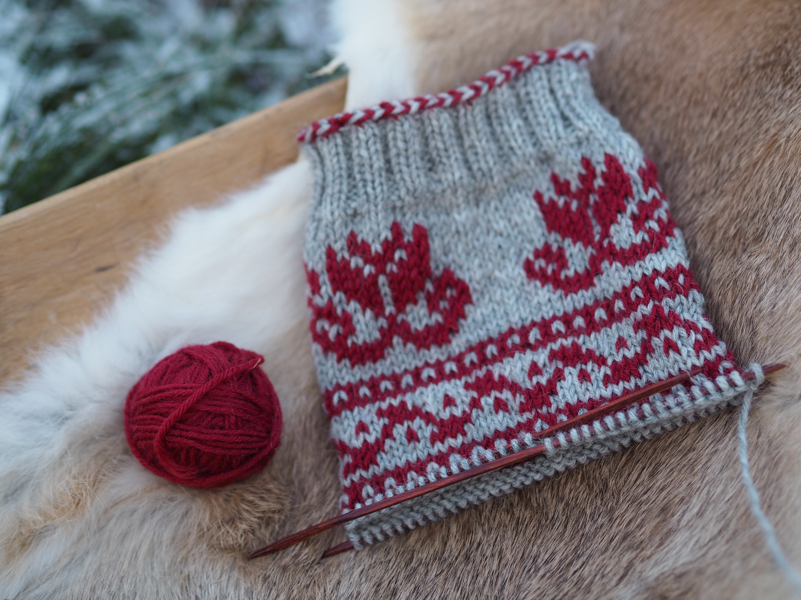 Var också uppmärksam på att det är extra viktigt att din tvåfärgsstickning inte stramar här, utan att strukturen bör vara flexibel för att skaftet inte ska bli för tajt vid användning sedan.]