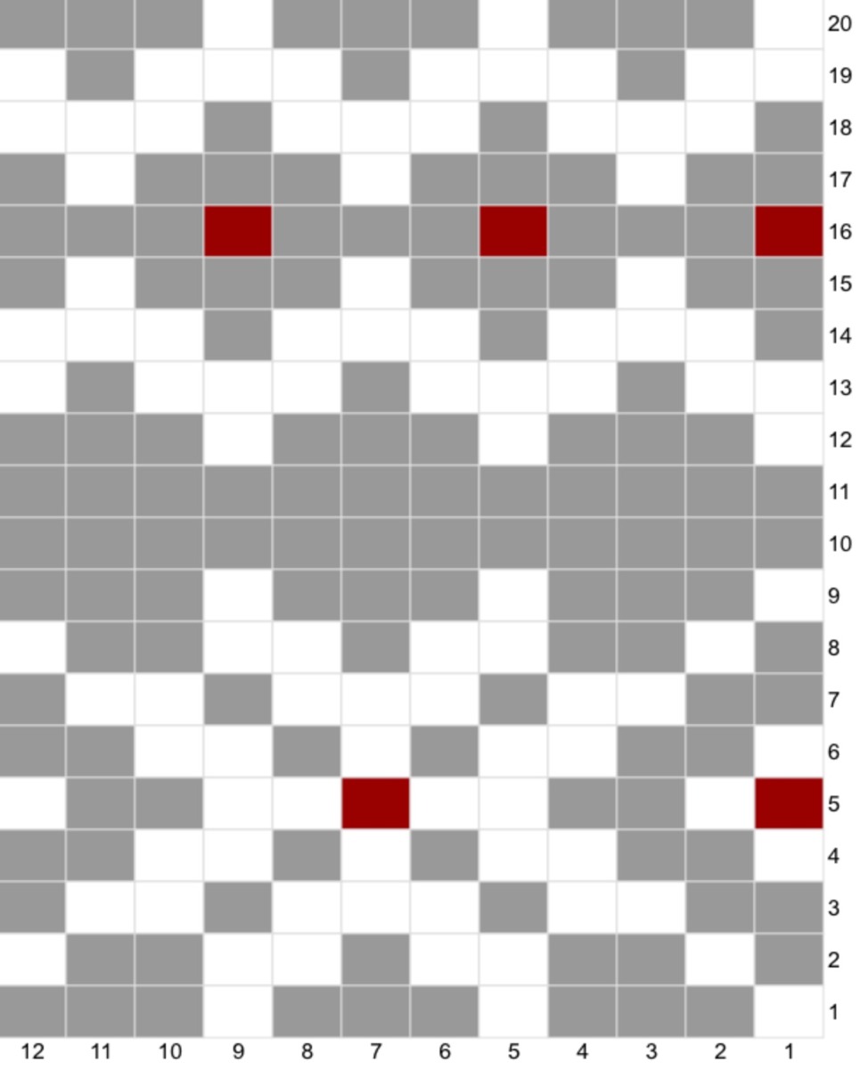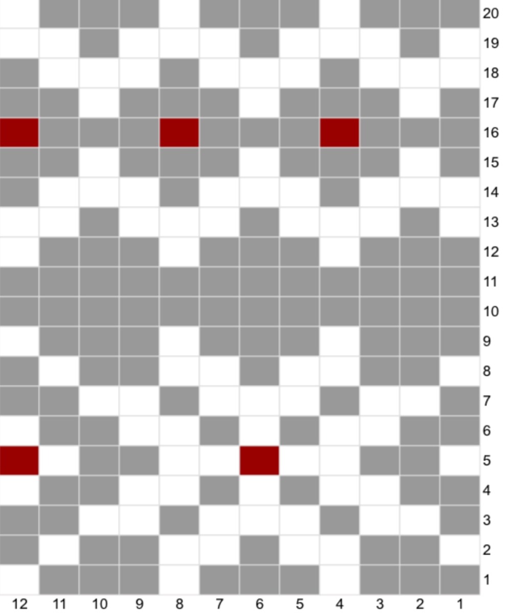 Sticka enligt diagram nedan, varv 1-20. (Maska 1-12 upprepas 4 ggr per varv.) OBS! Här kan du läsa mer om att sticka mönster med två färger!