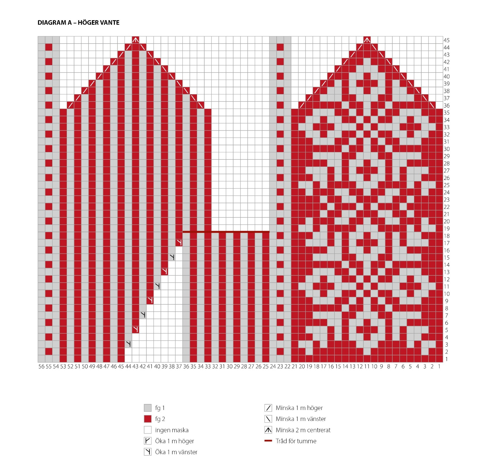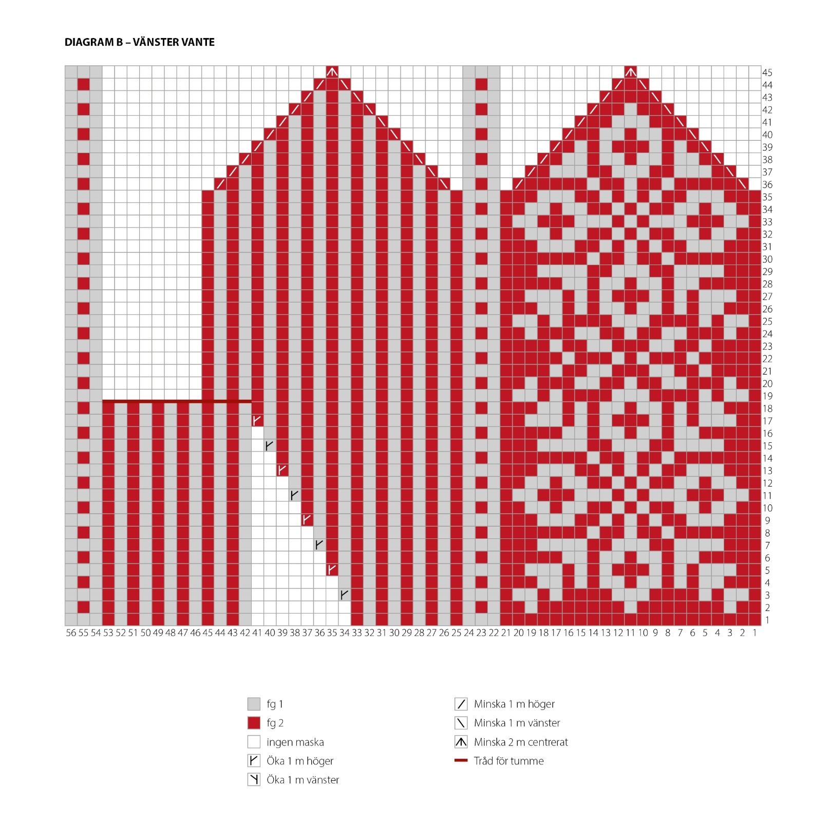 Sticka enligt beskrivning för höger vante, men enligt diagram B istället för A, och placera tumkilens markör efter 9:e maskan på sticka 3. Öka sedan före markören enligt diagram B, med tekniken ”ö1mh”. De fyra nya maskorna som läggs upp bakom tummaskorna, görs i omvänd färgordning mot höger vante.
