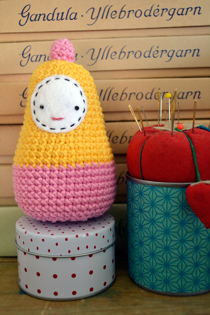 Varv 30 + övriga varv: *1 fm, hoppa över 1 maska, 1 fm*, upprepa *-* tills du har ett litet hål kvar. Stoppa dockan ganska hårt med vadd. Fortsätt virka tills hålet försvinner, ta av garnet och fäst.