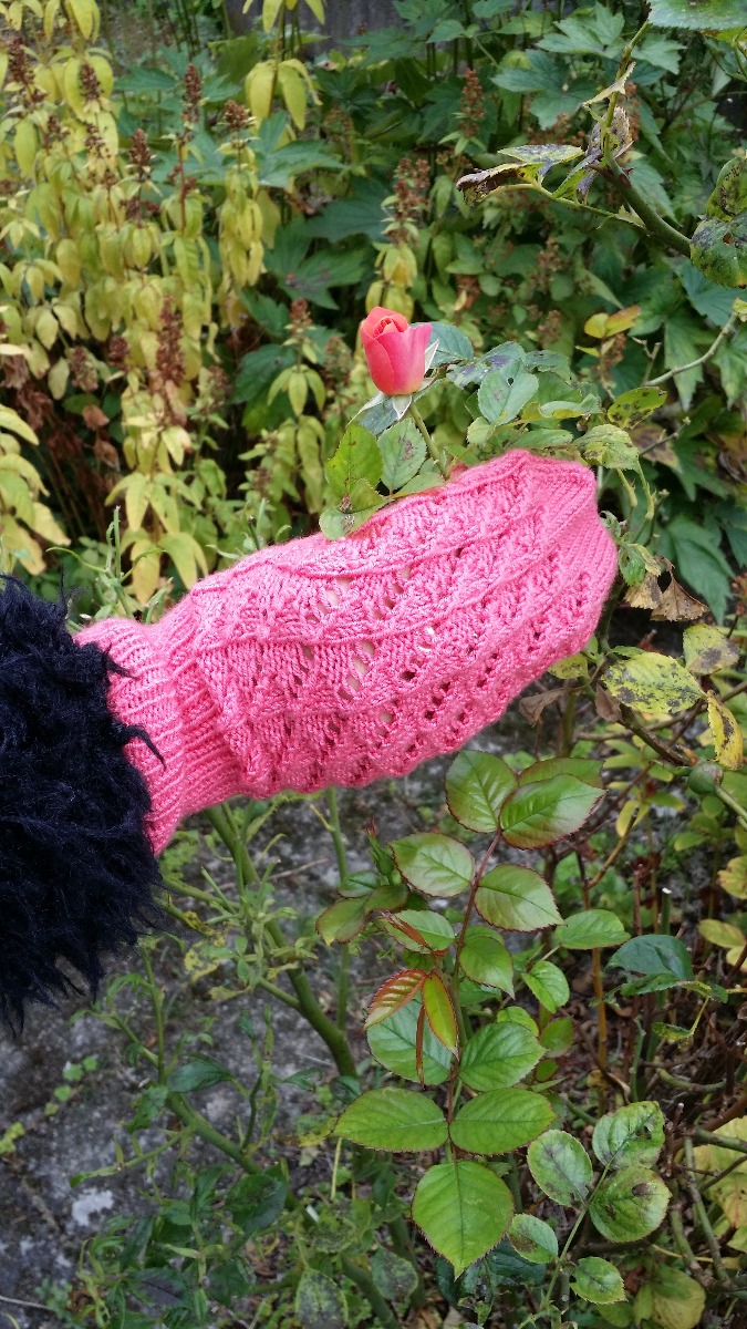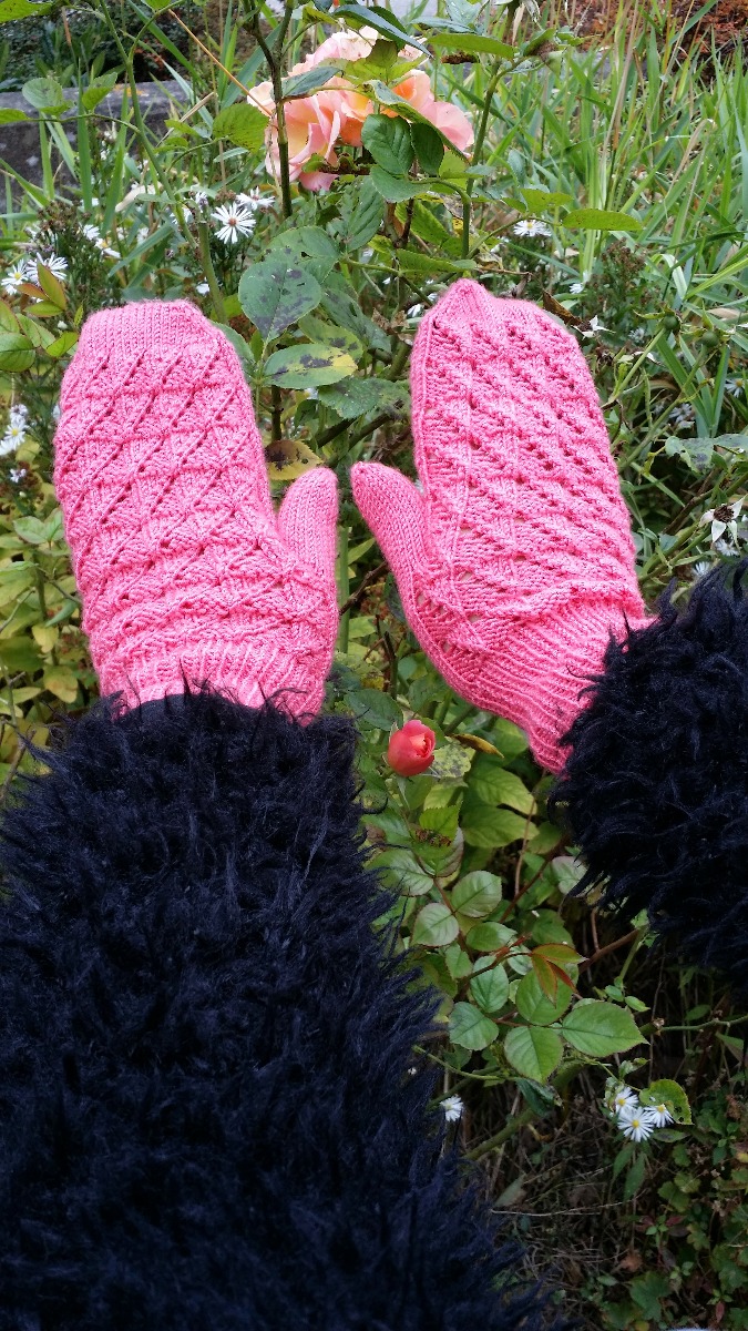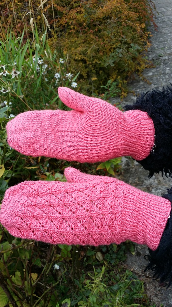 Istället för slätstickning på vantens ovansida (25 m) går det lika bra att sticka in mönster. Till exempel detta spetsmönster som Maja delat med sig av: