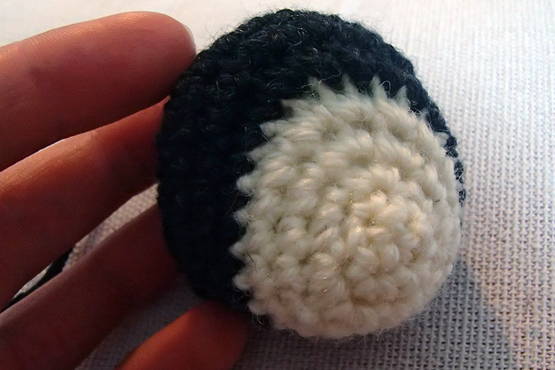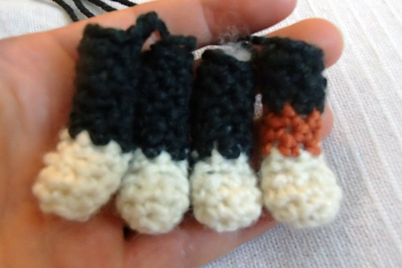 Här byter du färg till grått på det trefärgade benet. Övriga ben fortsätter virkas med grått.