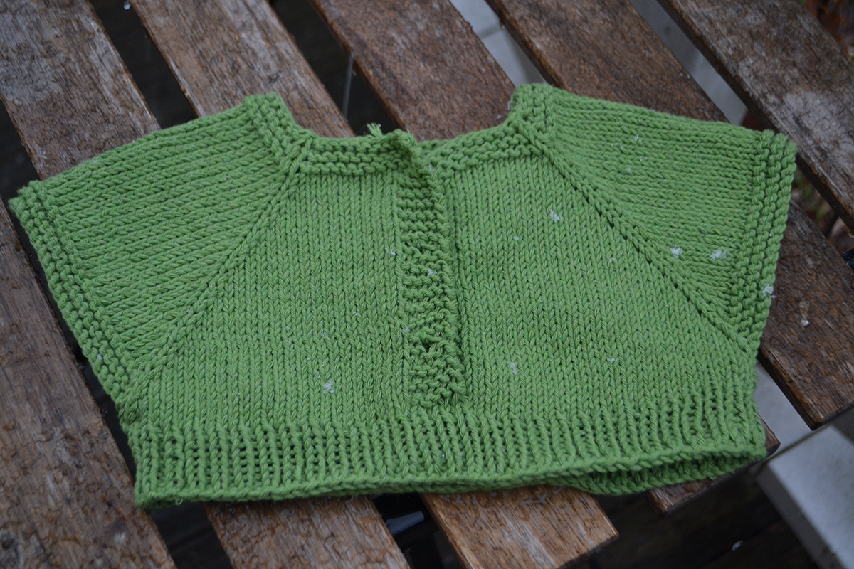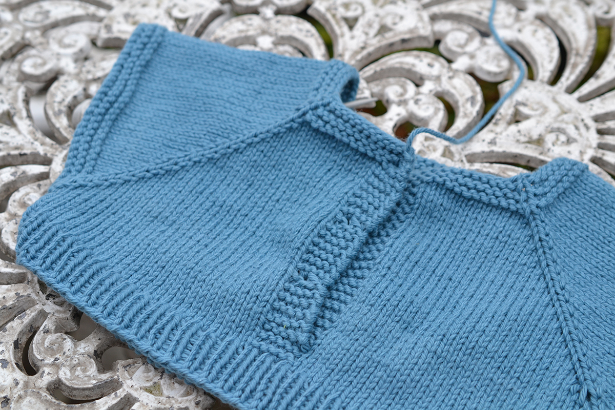 Varv 12: nu syns raglanränderna ganska tydligt. På detta v och alla ökningsv framöver, *sticka fram till raglanm, 1 omsl, raglanm r, 1 omsl*, upprepa 3 ggr och sticka återstående m räta.