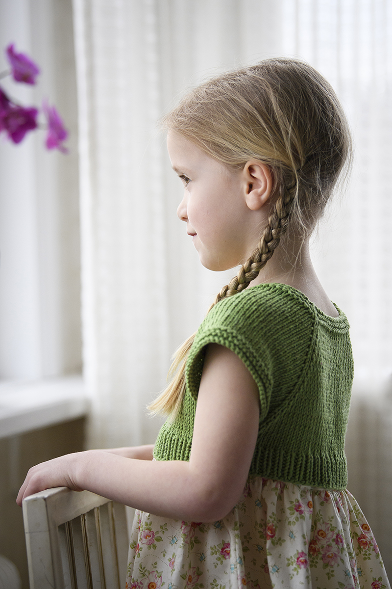 Klänningarna med grönt ok är stickade i Järbos bomullsgarn Reko, som är gjort av återvunna bomullsfibrer från trikåindustrin – inte bomull som har varit kläder och liksom utvunnits igen utan spillmaterial från klädtillverkning. Det är inte så hårt spunnet, så man får vara lite extra noga med att få med sig alla trådar hela tiden. Vill man vara extra miljövänlig matchar man det såklart med återbrukat tyg i kjoldelen!