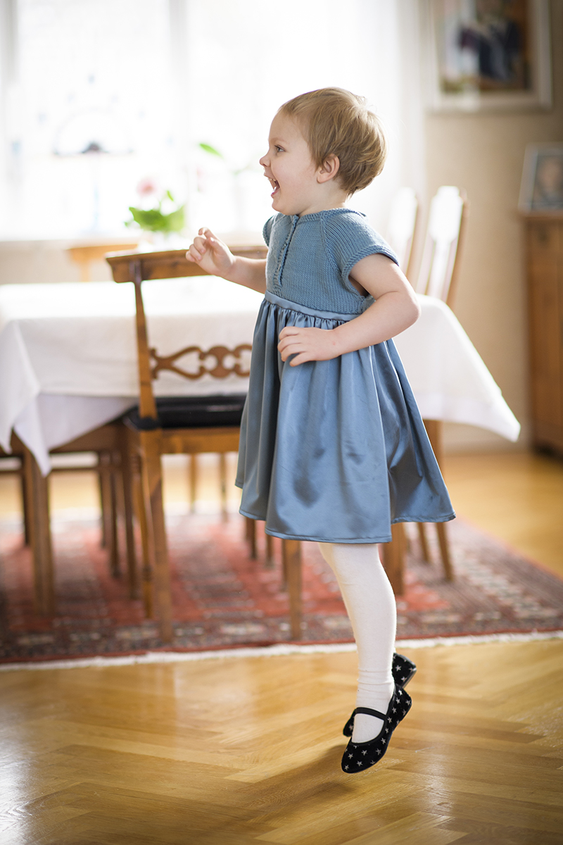 Stickar man oket i bomullsgarn passar det förstås bra att sy kjolen i bomullstyg. De båda klänningarna här har bomullskjolar (jag tror att tyget kommer från Panduro). Jag tycker att de skulle kunna vara fina som brudnäbbsplagg på ett sommarbröllop, till exempel. Särskilt om någon i brudparet stickar! Men den första klänningen som Ulla och jag gjorde fick en enfärgad kjoldel i ett sidenliknande tyg. Det blev en festklänning som jag tycker passar året runt!