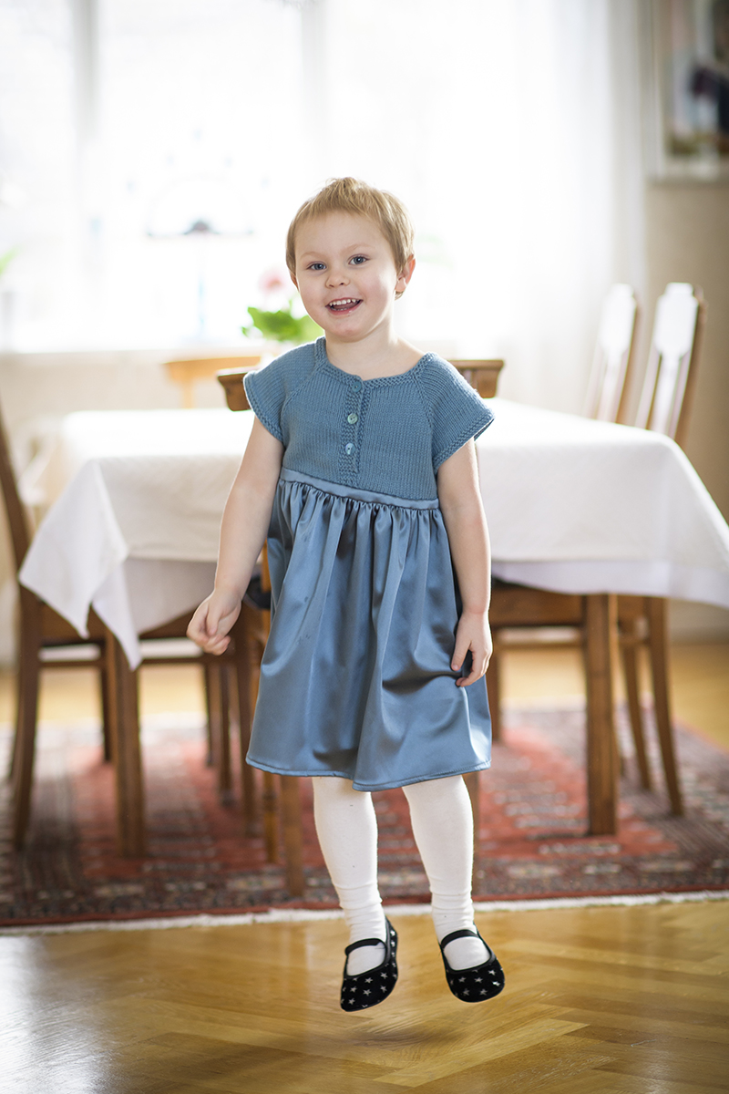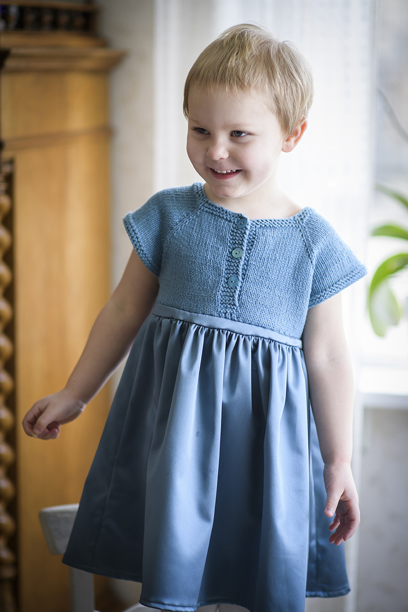 Den här klänningen har alltså ett stickat ok som är identiskt med det som är början på Två trådändars lilla väst och Två trådändars lilla slipover men som avslutas direkt efter holkärmarna. På det syr man en kjoldel i något tyg som man tycker passar.