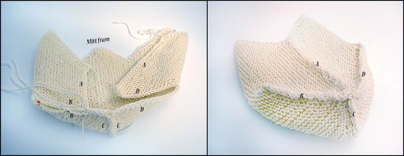Sy ihop mössan enligt bilderna: Kant C mot kant C, B mot B, D mot D, samt A mot A. Använd kantm till sömsmån. Försök göra sömmen så platt som möjligt, bebisar ska inte behöva ha tjocka sömmar i nacken.