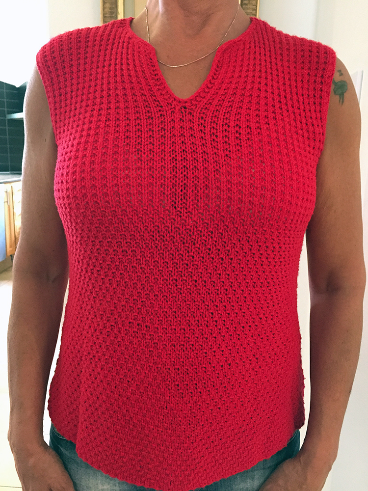 Sticka ihop axlarna genom att plocka 1 m från bakst och 1 m från framst osv. När alla m är upplockade, stickas maskorna ihop 2 och 2. Maska av som vanligt. Det går bra att avm axelns m och sy ihop axlarna men det blir fint och jämt när det stickas ihop. Sy sidsömmarna och virka med fasta m runt halsen och i ärmhål.