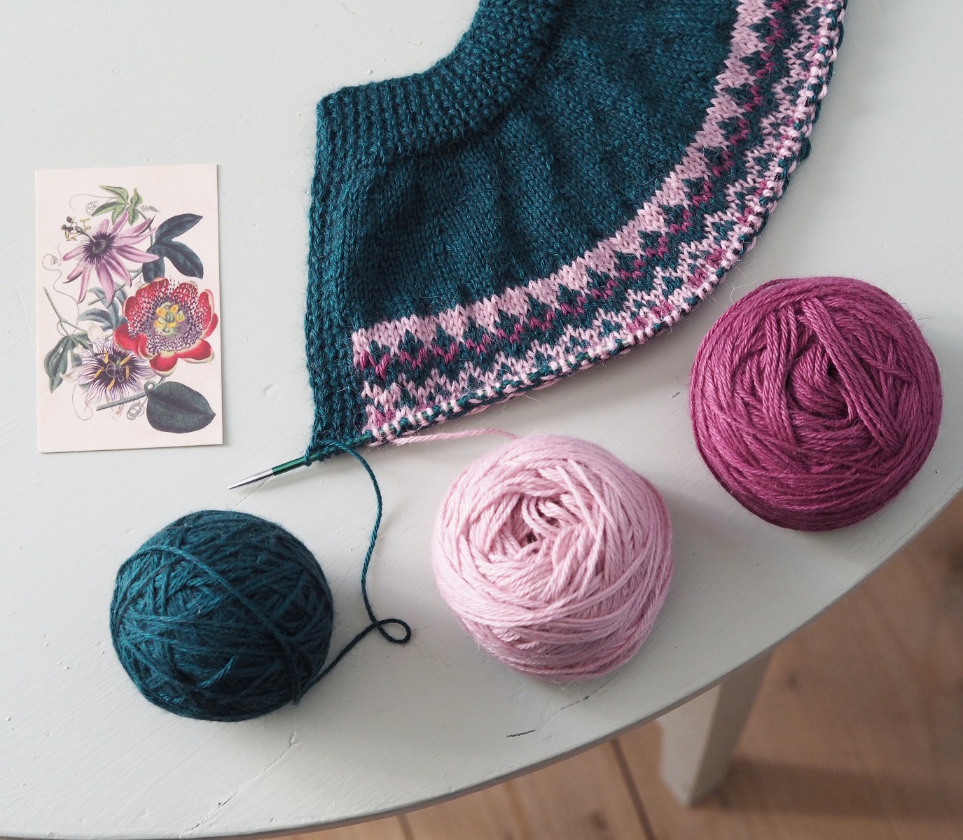 Här har jag börjat sticka det flerfärgsmönstrade partiet. Jag använder mig av färgerna 12209, 12211 och 12214. När man ska kombinera färger är det tacksamt att utgå från ett motiv med en färgställning man tycker om, och sedan översätta nyanserna till garn.