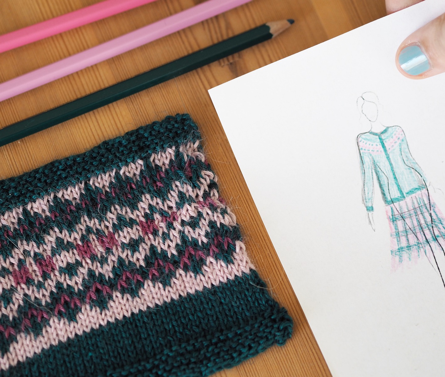 Eftersom färgerna är så ljuvliga valde jag att lägga in ett flerfärgsstickat parti där tre olika nyanser kombineras. På bilden ovan syns provlapp och grovskiss. Jag gör alltså en kofta med flerfärgsstickat ok. Provlappen är viktig för att jag ska kunna beräkna plaggets mått utifrån masktätheten. Den ger mig också möjlighet att prova det flerfärgsmönster som jag tidigare skissat fram.