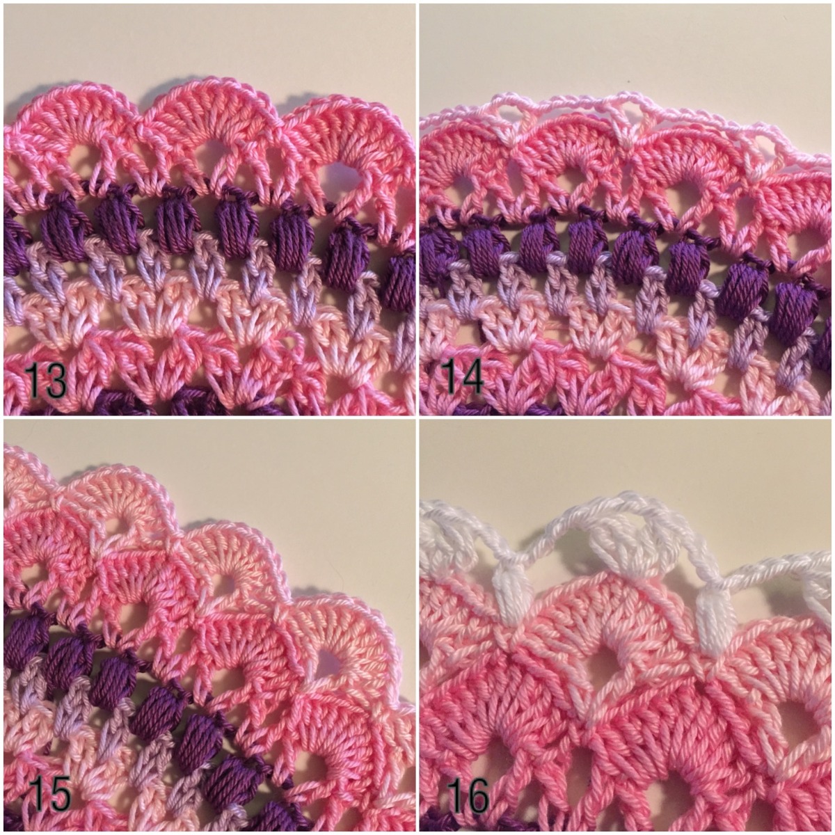 13. *9st i lmb, 1fm i nästa lmb* upprepa *_* varvet runt. Se bild 13.