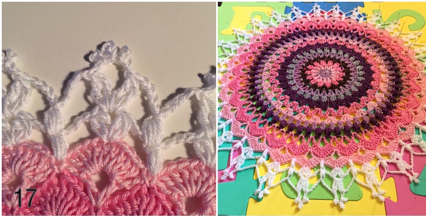 *[2dst tills. 1lm, 1 picot grupp, 1lm, 2dst tills.] i lmb mellan st-gruppen, 5lm, 4hst tills. i toppen av hst-gruppen, 5lm* upprepa *_* varvet runt. Se bild 17.