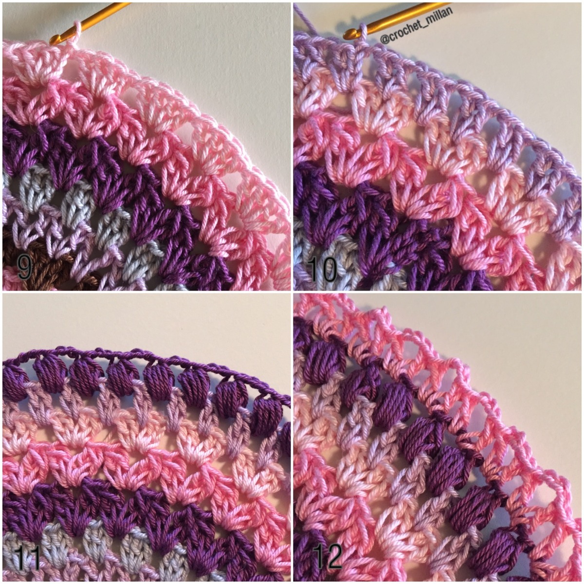 10. *2st mellan st-grupp, 1lm, hoppa över 2st, 2st i mitten utav st-gruppen, 1lm* upprepa *_* varvet runt. Se bild 10.