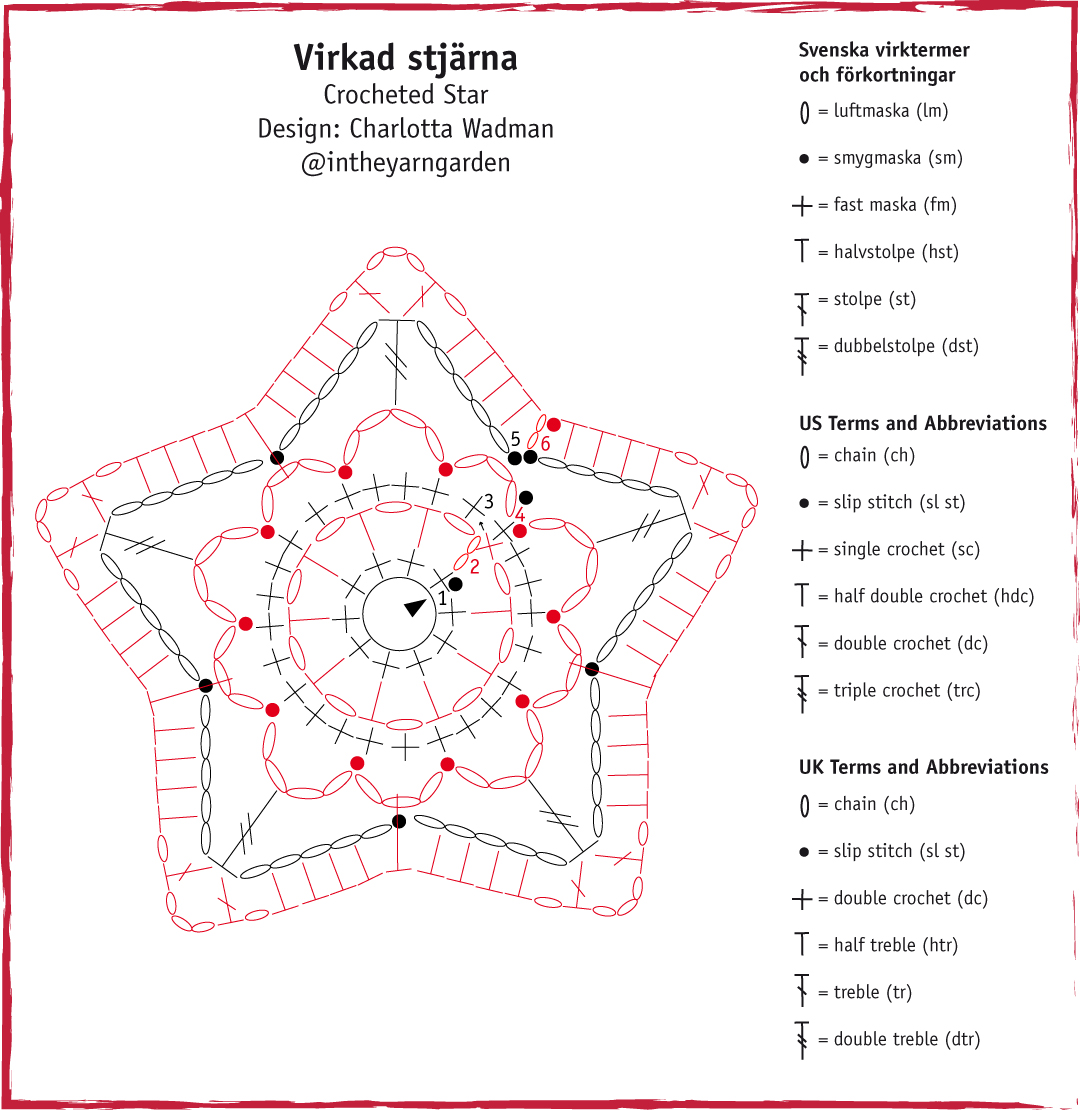Varv 6: Virka 2 lm, (4 hst om nästa 5-lmb, 1 lm, [1 st, 3 lm, 1 st] i nästa dst, 1 lm, 4 hst om nästa 5-lmb, 1 hst i nästa 3-lmb från varv 4) 5 ggr, avsluta med 1 sm i 2:a lm.