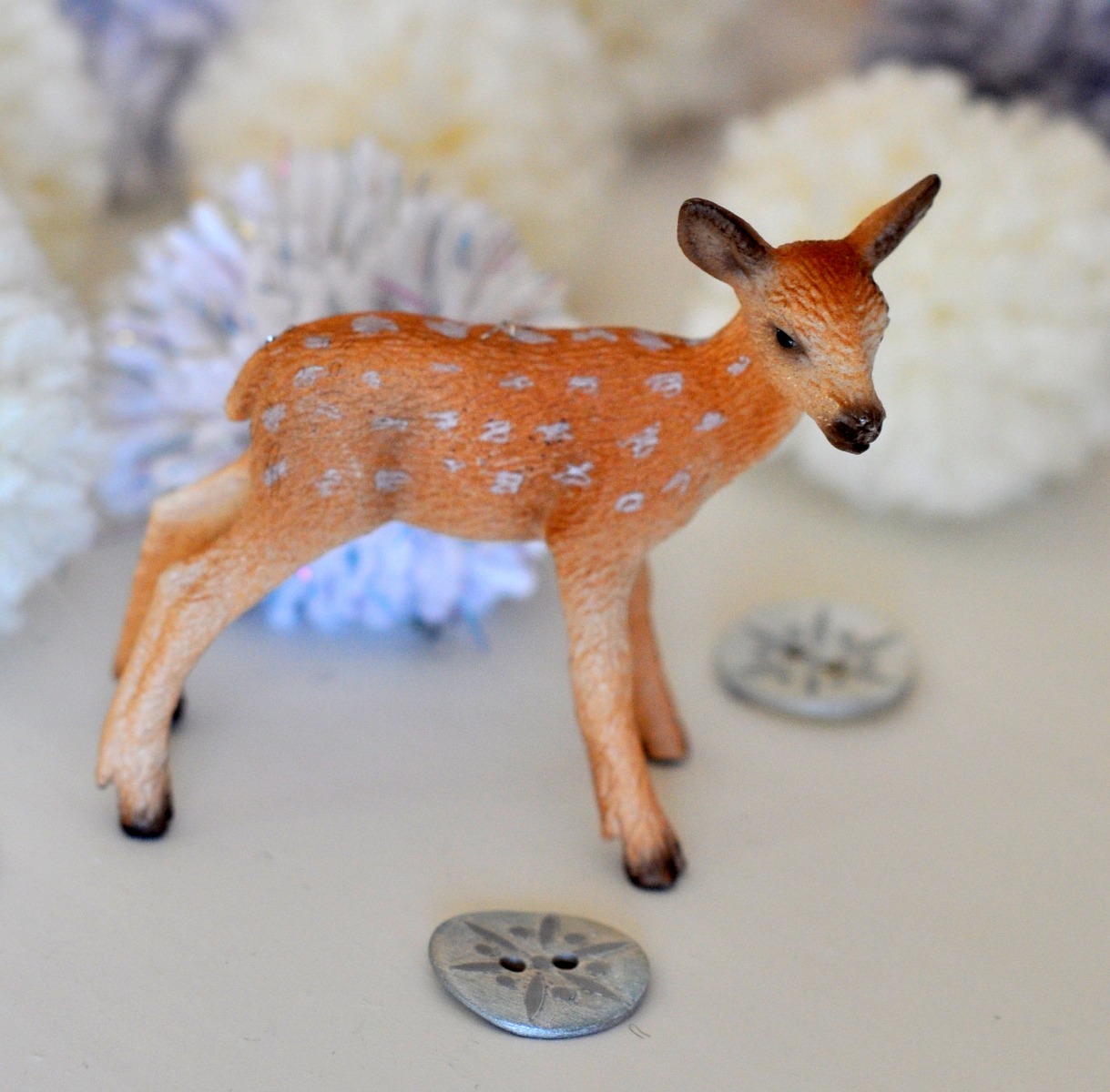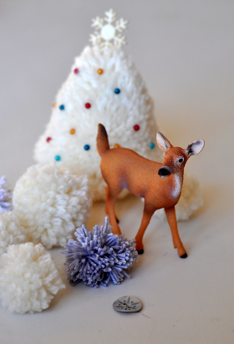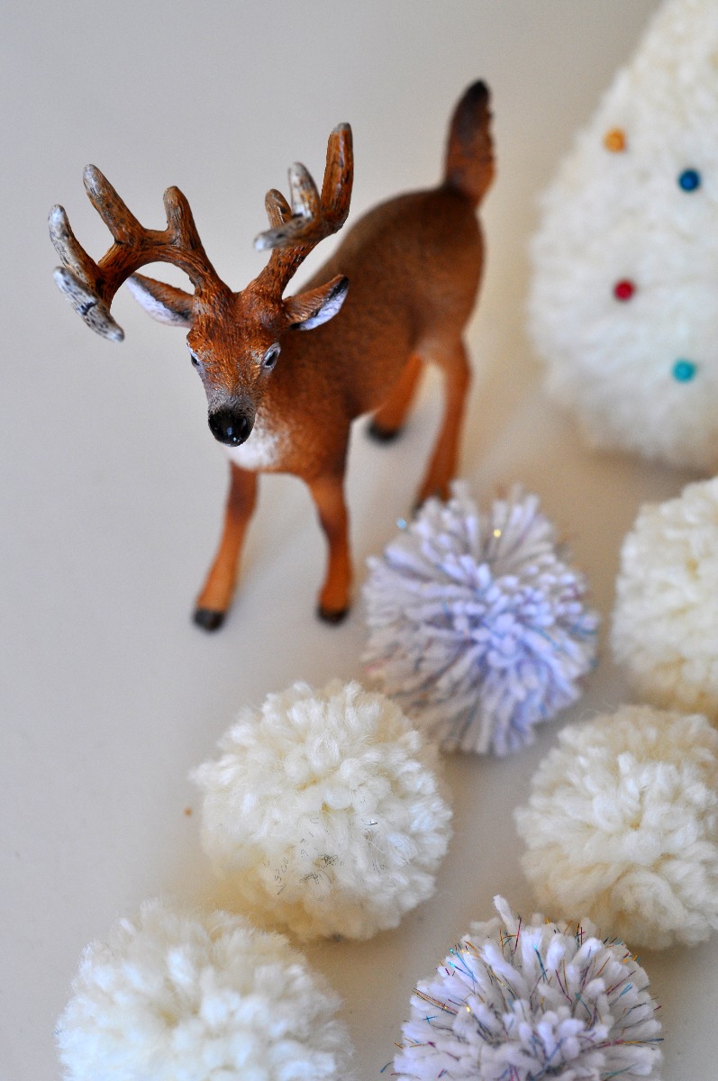 Du behöver: Pompom-makare i olika storlekar, garn i vita/silvriga nyanser (jag använde Ulla, Järbo 8/4 och Miniakryl Metallic), gnistrande knappar eller paljetter, knappnålar i fina färger och söta plastdjur ( – min kronhjortsfamilj kommer från den anrika firman Schleisch, och säljs i de flesta leksaksaffärer).