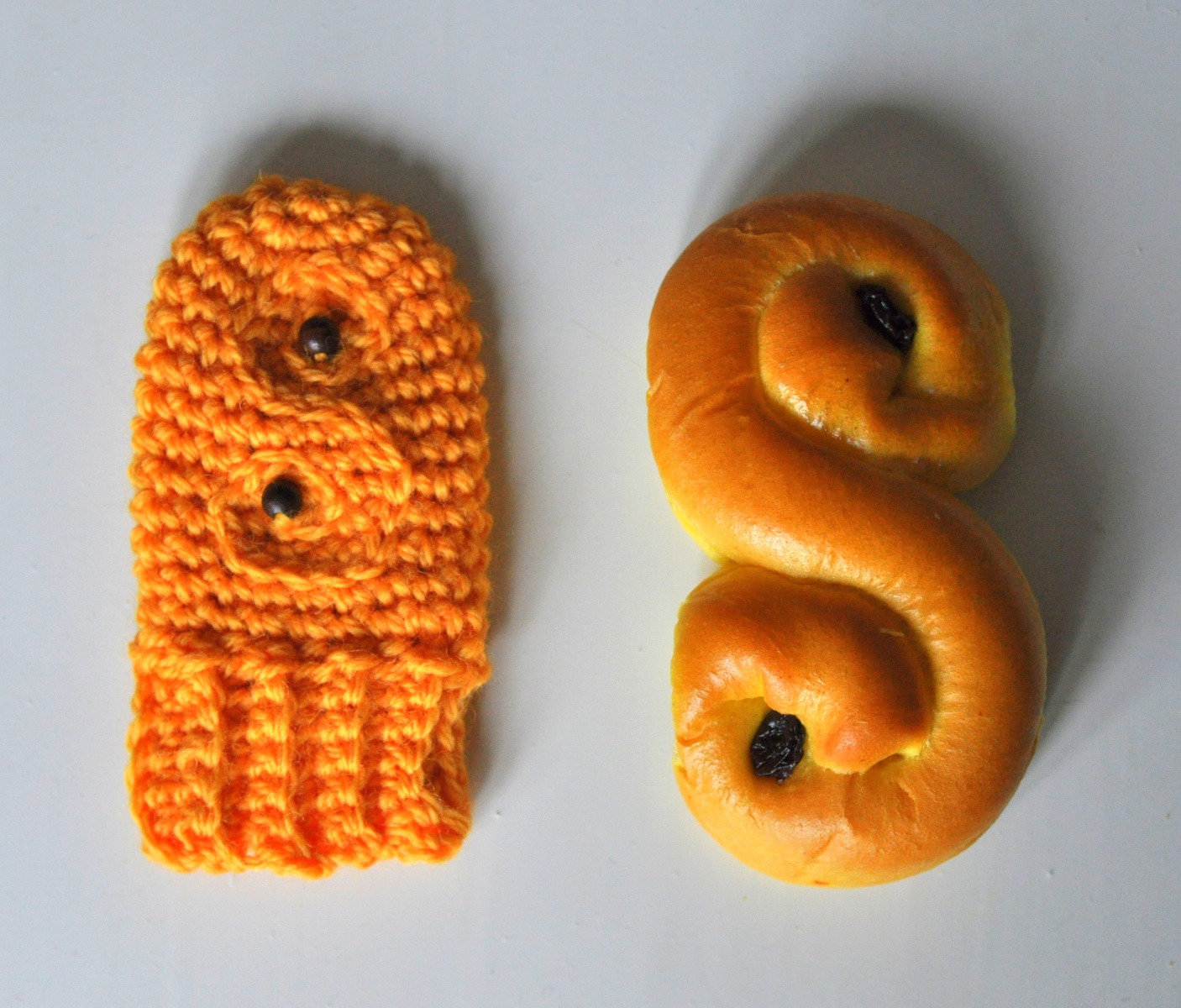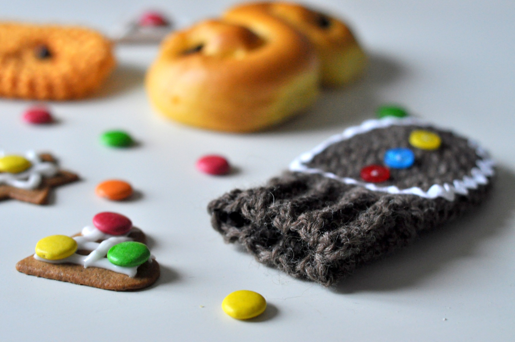 Tillbehör: Pepparkaka: 60 cm vitt zickzack-band och 6 stycken små färgglada knappar. Saffransbulle: 4 bruna träpärlor.