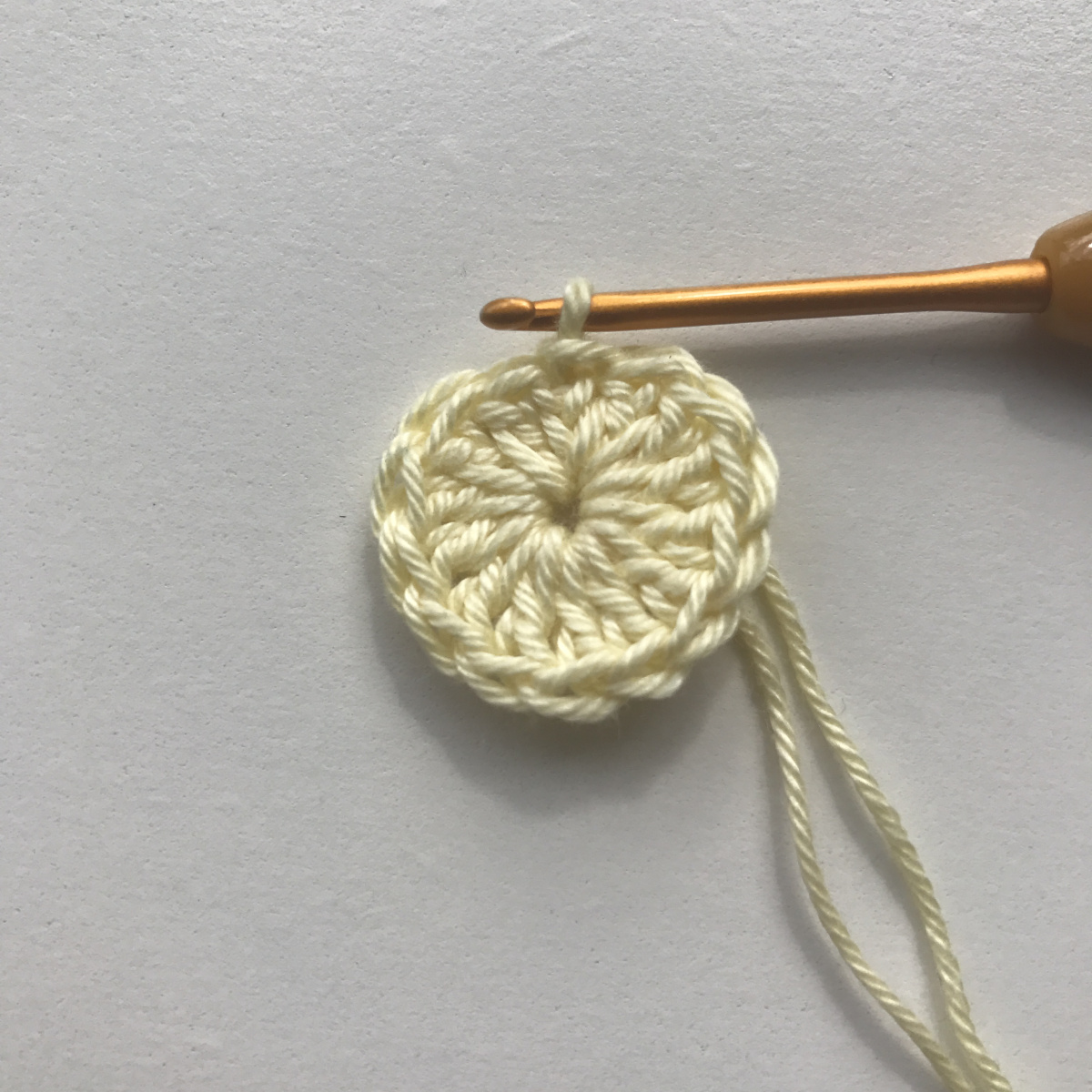 - 14st i en magisk ring, avsluta varvet med 1sm i första st, tag av garnet byt färg. Se bild 1.