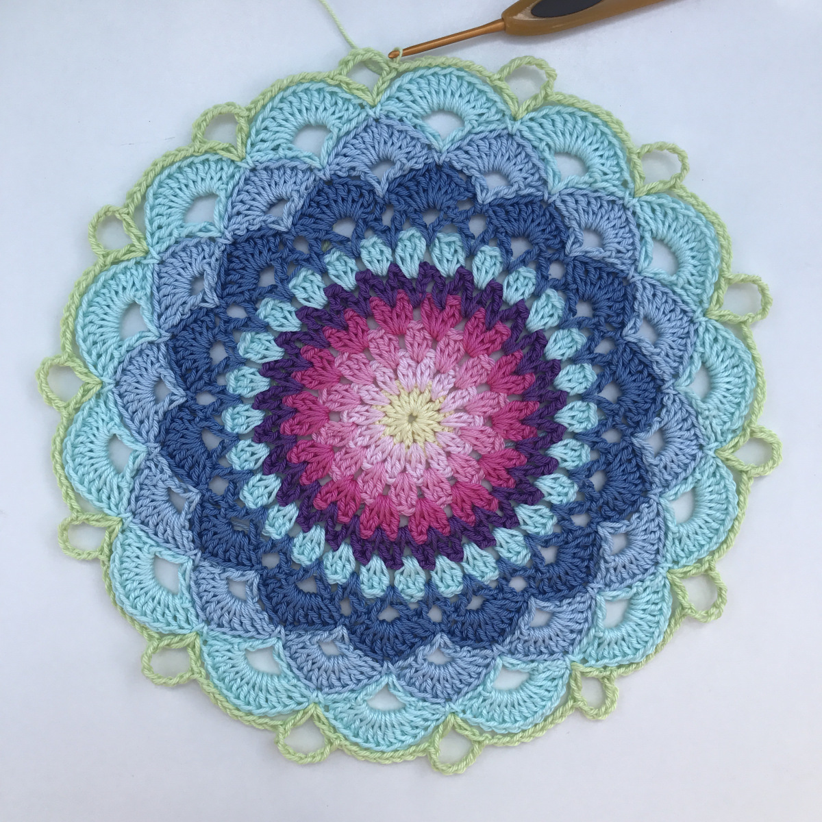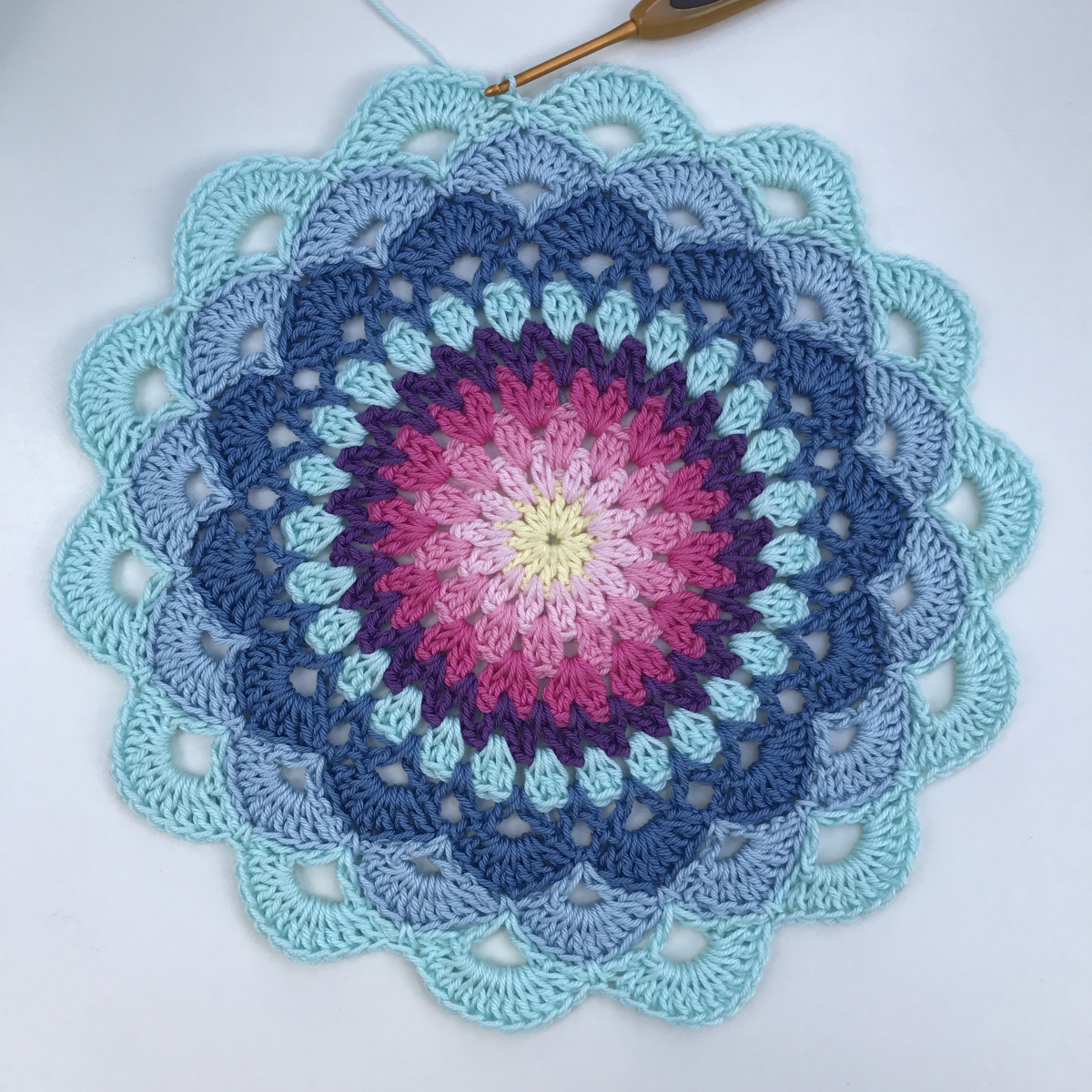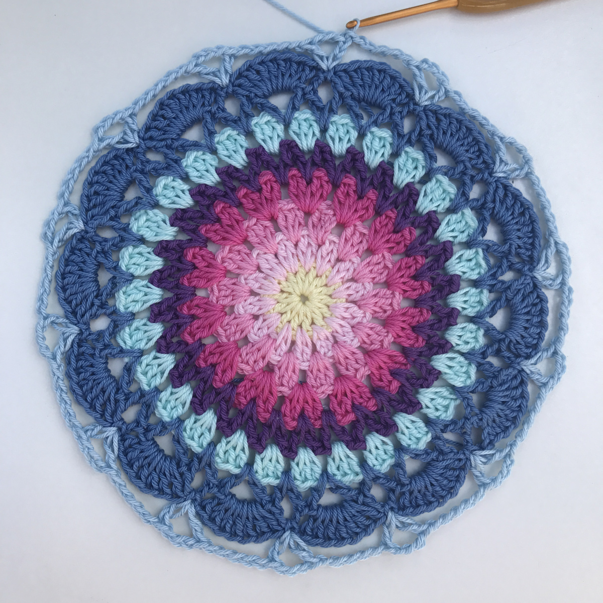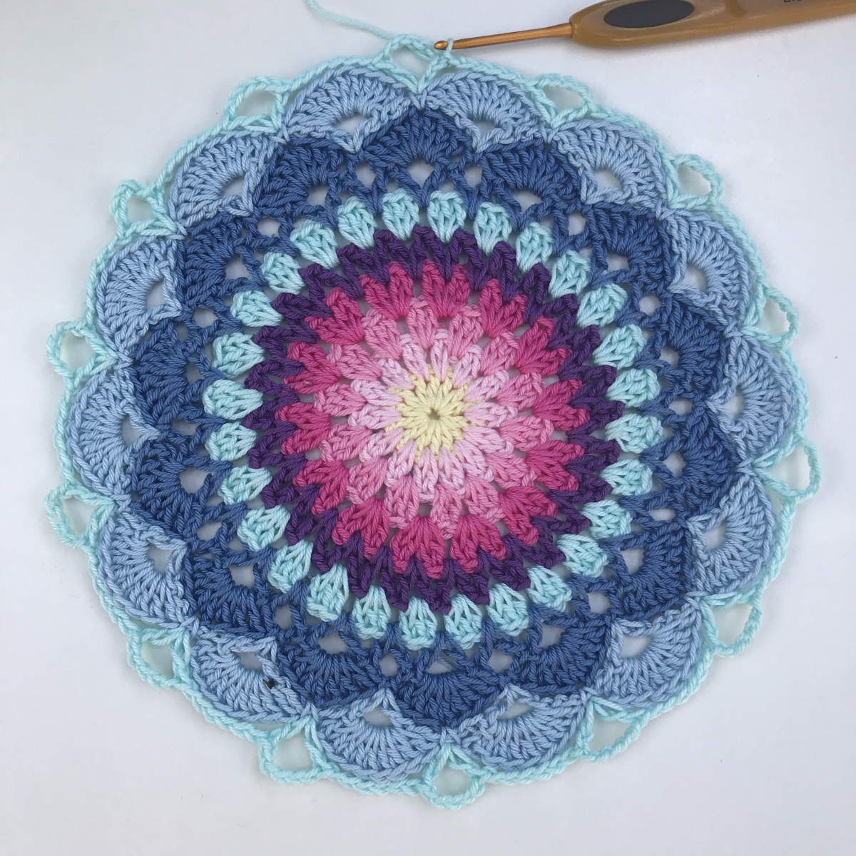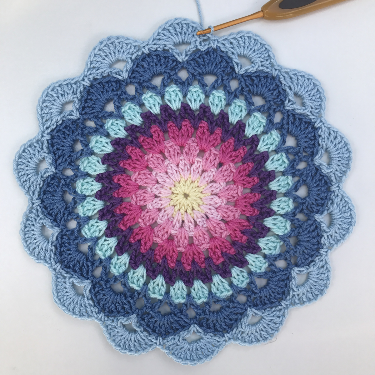 - *1st i toppen av st-gruppen, 2lm, 1st om nästa lmb, 2lm, 1st i nästa st-grupp, 2lm, (1st 3lm 1st) om nästa lmb (mittersta lmb), 2lm, 1st i nästa st-grupp, 2lm,1st om nästa lmb, 1st i nästa st-grupp* upprepa *__* varvet runt, avsluta varvet med 1sm i första st, tag av garnet fästa alla trådar och blocka din mandala duk.