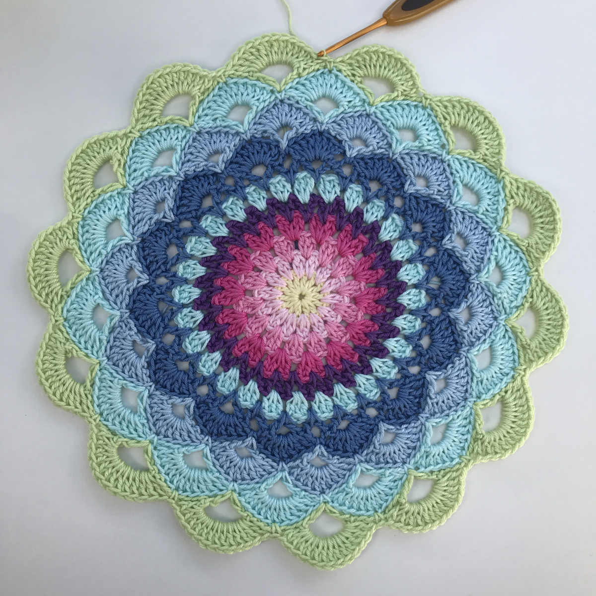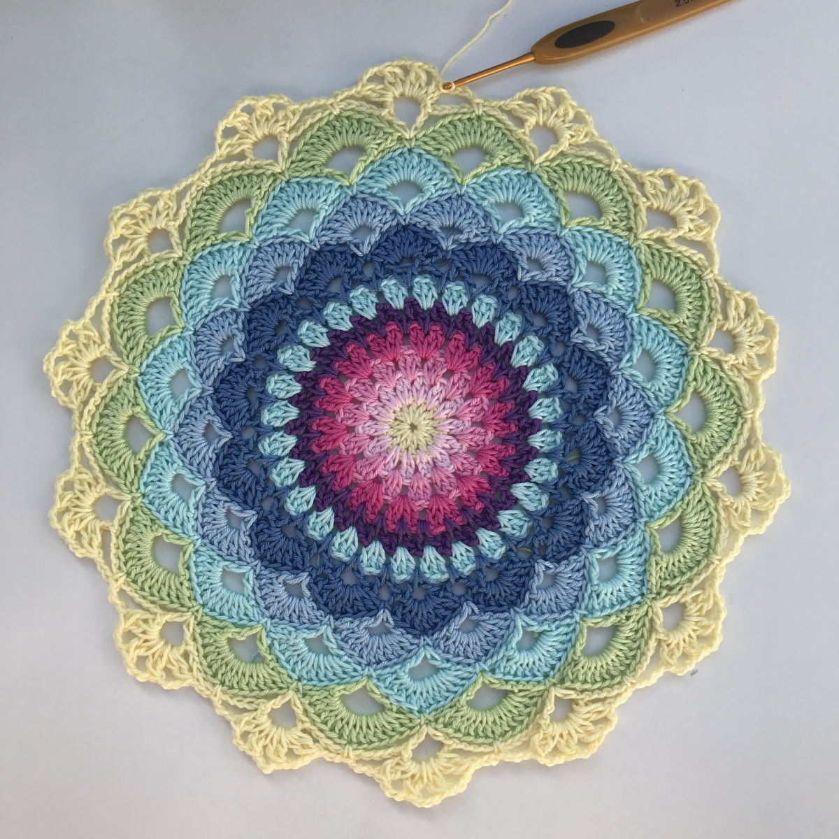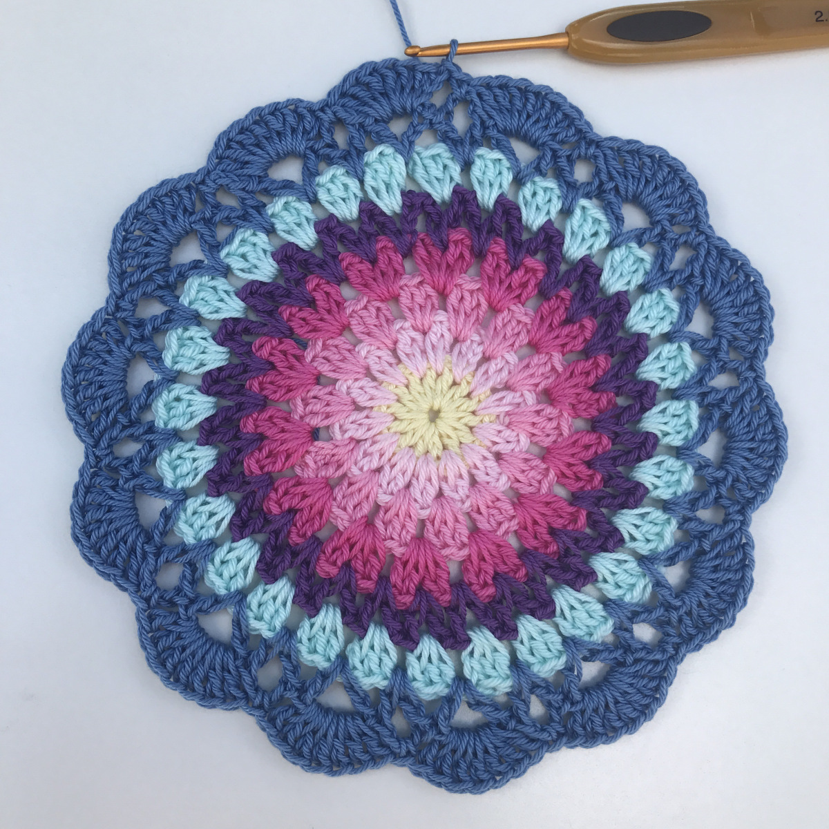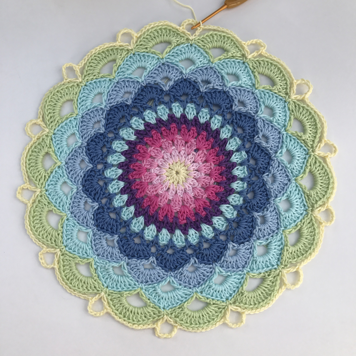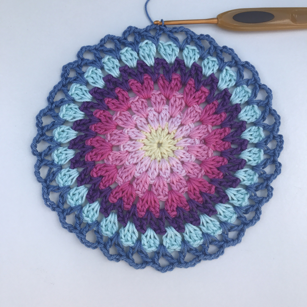 - *1st i toppen av st-gruppen, 2lm, 1st om nästa lmb, 2lm, 1st i nästa st-grupp, 2lm, (1st 3lm 1st) om nästa lmb (mittersta lmb), 2lm, 1st i nästa st-grupp, 2lm,1st om nästa lmb, 1st i nästa st-grupp* upprepa *__* varvet runt, avsluta varvet med 1sm i första st, tag av garnet fästa alla trådar och blocka din mandala duk.