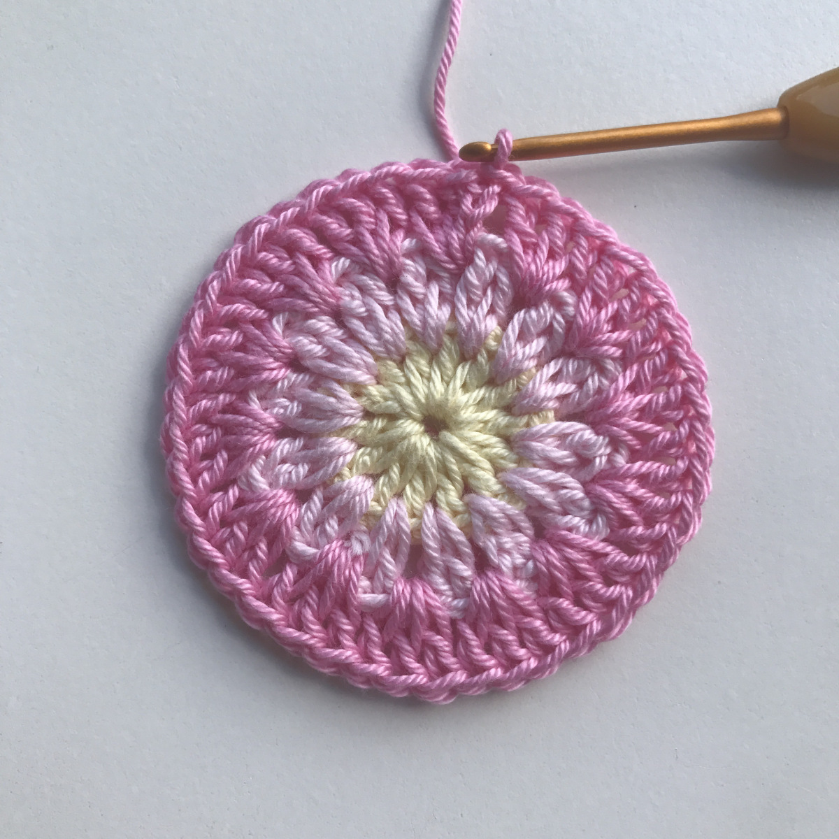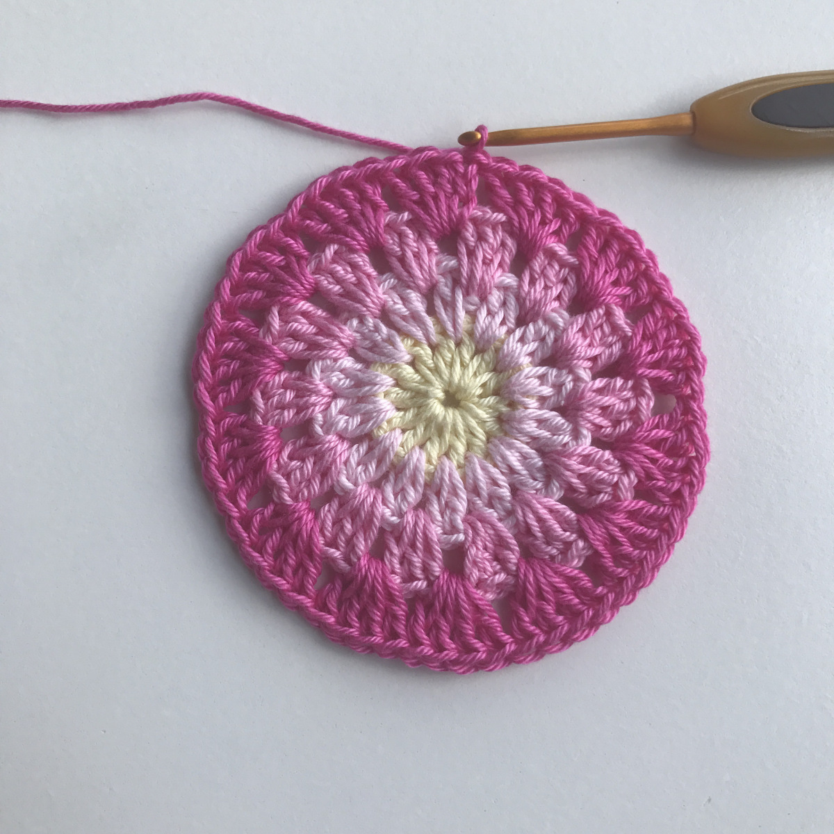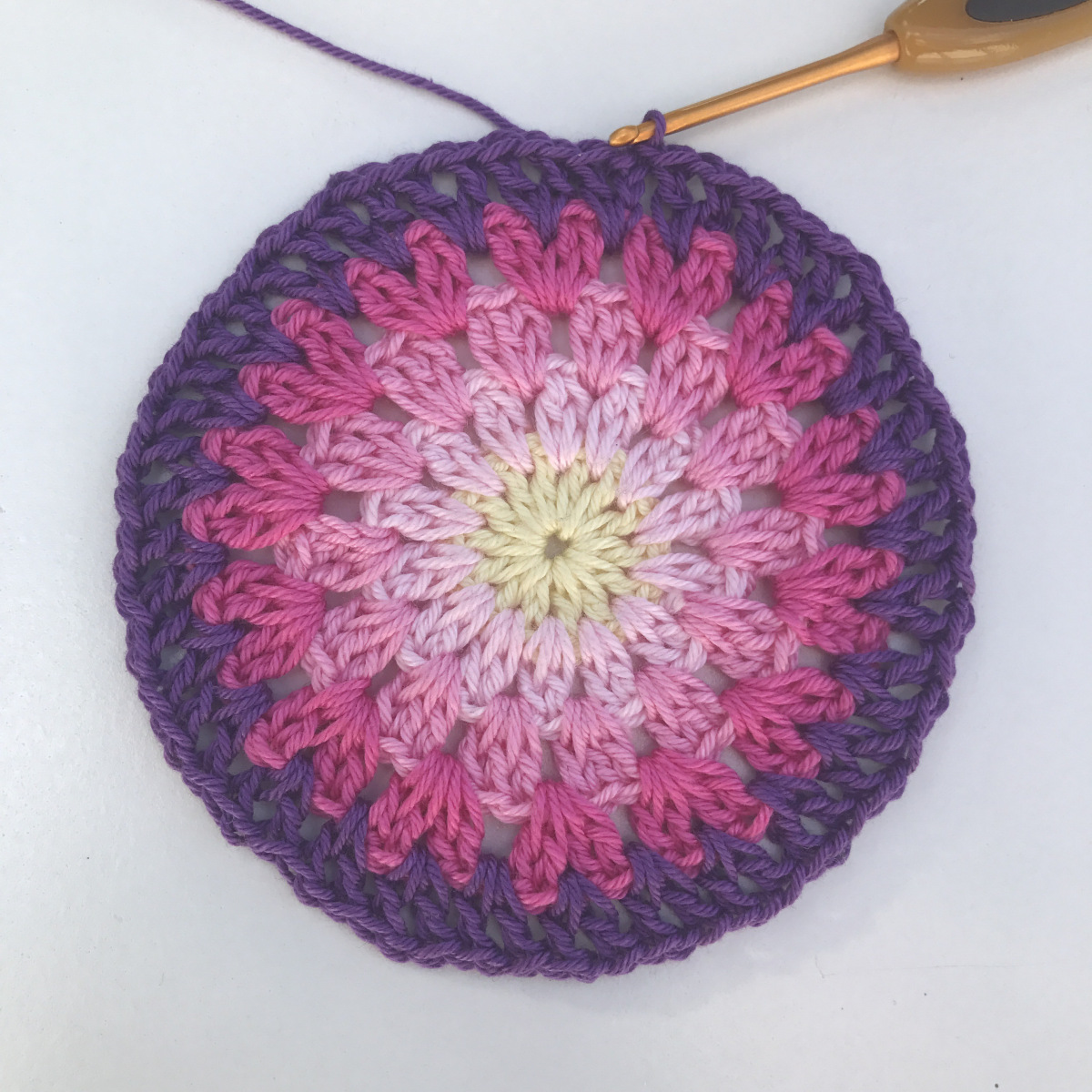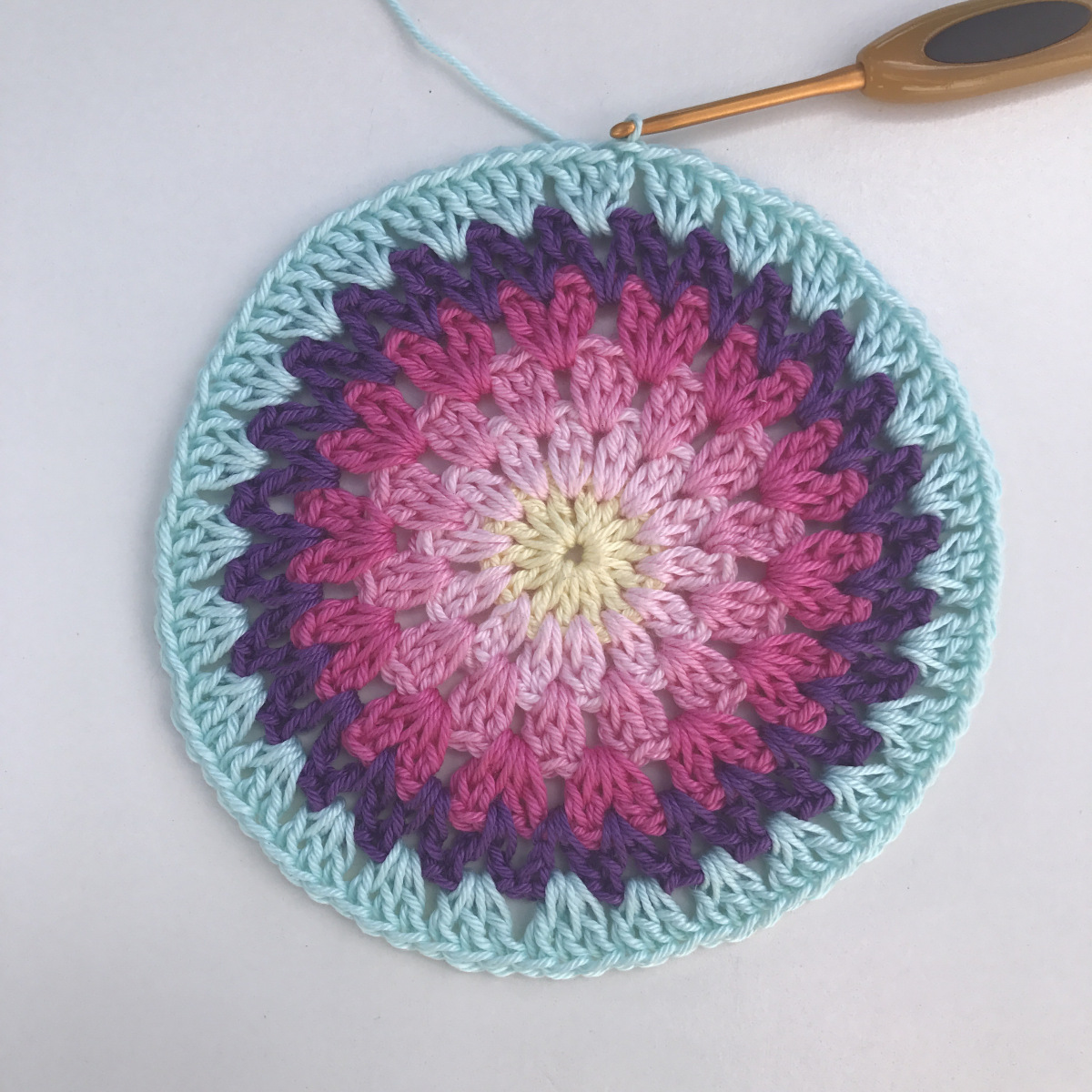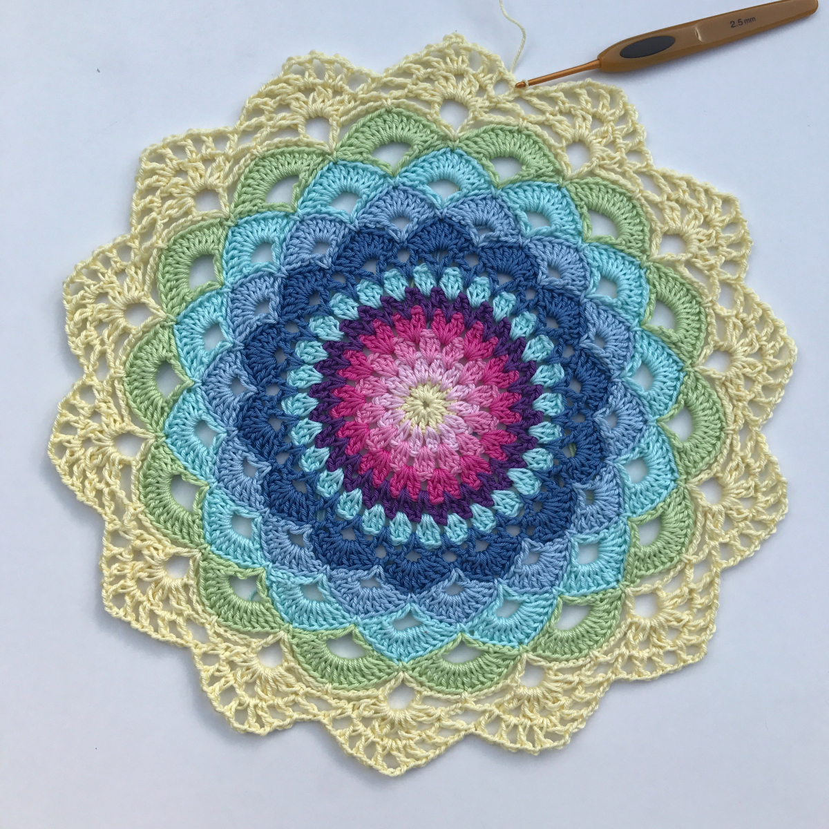 - *1st i toppen av st-gruppen, 2lm, 1st om nästa lmb, 2lm, 1st i nästa st-grupp, 2lm, (1st 3lm 1st) om nästa lmb (mittersta lmb), 2lm, 1st i nästa st-grupp, 2lm,1st om nästa lmb, 1st i nästa st-grupp* upprepa *__* varvet runt, avsluta varvet med 1sm i första st, tag av garnet fästa alla trådar och blocka din mandala duk.