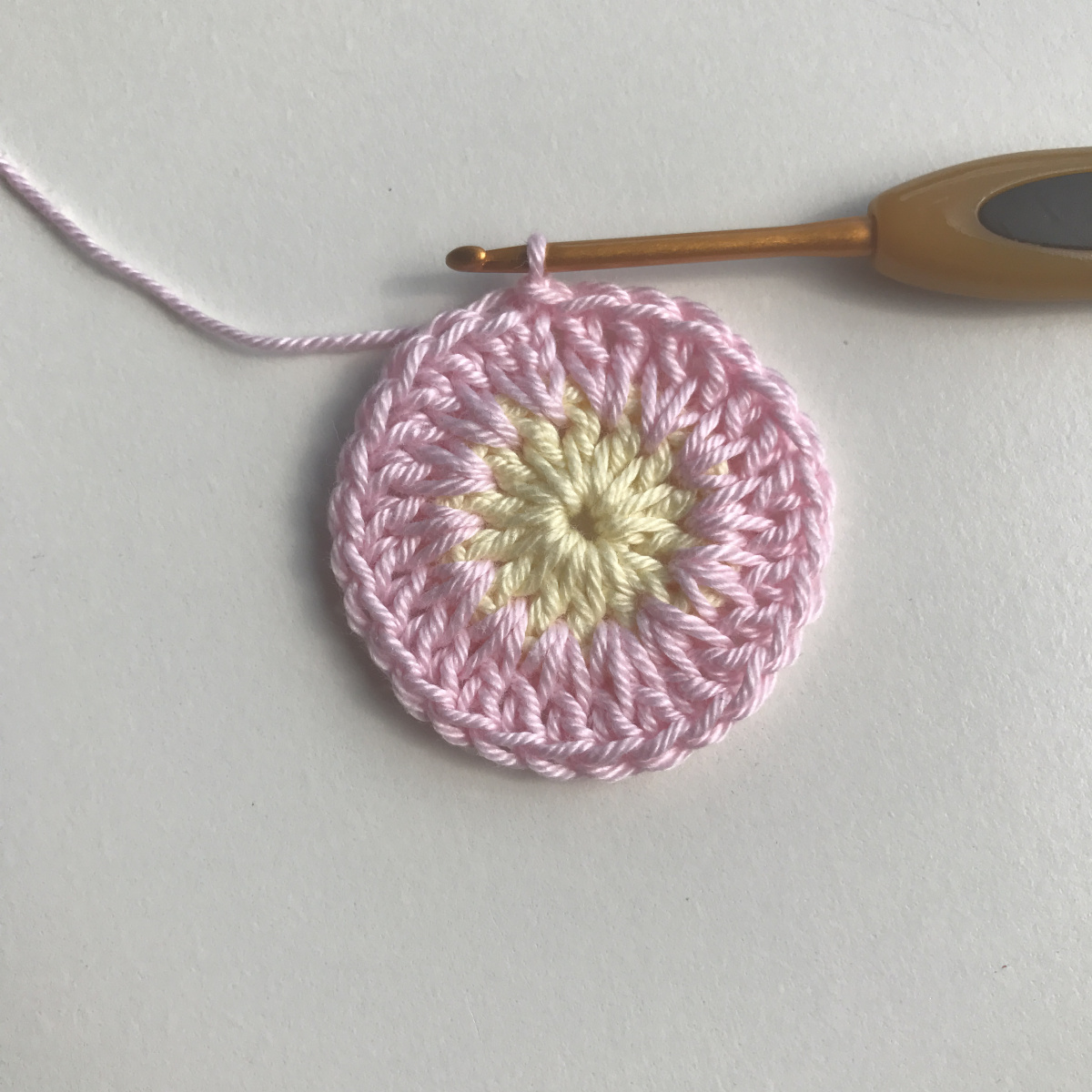 - 2st mellan varje st, avsluta varvet med 1sm i första st, (28st) tag av garnet byt färg. Se bild 2.