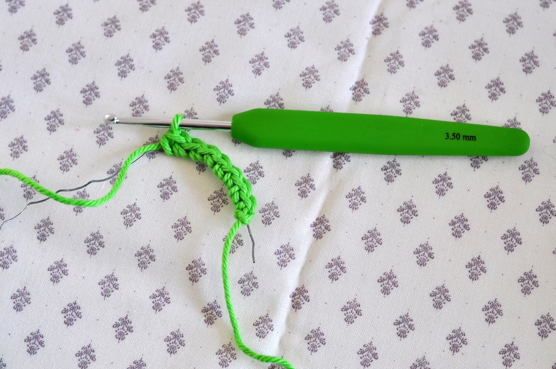Om du vill kan du också virka blad genom att använda samma teknik som för stjälken. Klipp av en bit ståltråd (ca 15 cm lång). Virka fm om ståltråden. När bladet har nått önskad längd vänder du tillbaka och virkar 2 sm, ca 10 fm, valfritt antal stolpar till du tycker bladet är lagom långt, 1 fm, 1 sm. Ta av garnet och dra igenom garnet. Fäst lösa trådar och vik in ståltråden i ändarna.