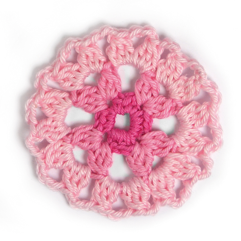 Varv 2: Med mellanrosa garn: Virka *[3 hopv st, 3 lm, 3 hopv st] i 2-lmb, 3 lm*, upprepa *-* 4 ggr.