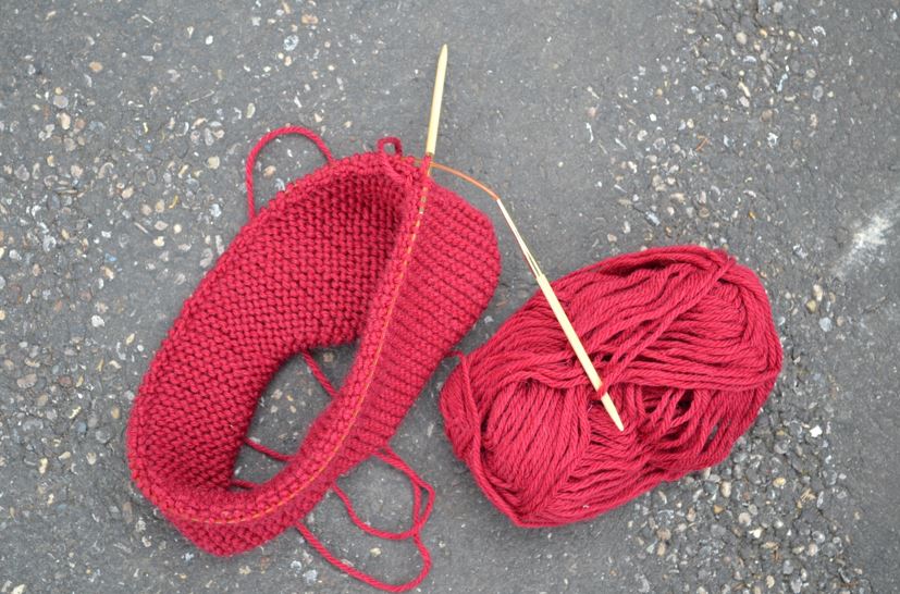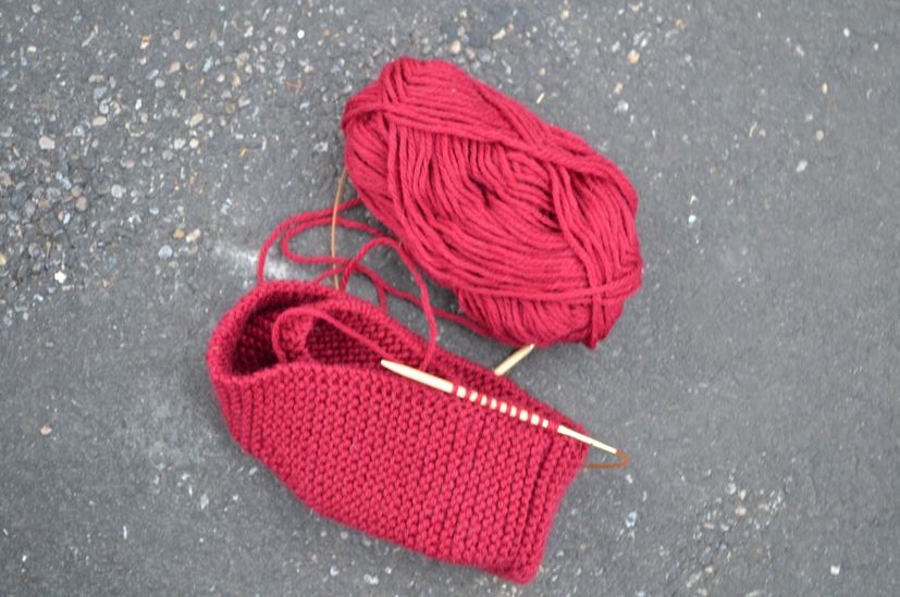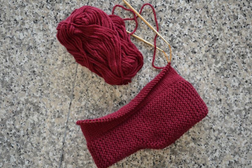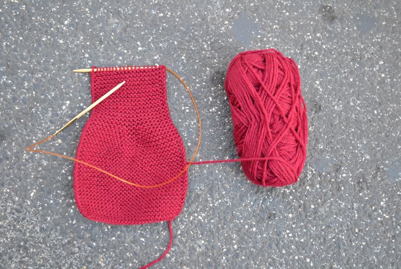 Sticka slätstickning runt, runt, och flytta kabelns ögla ibland så att du hela tiden kan sticka bekvämt. (Det här är samma nystan och samma stickning, men bilden är tagen inomhus, så färgen blev helt annorlunda.)