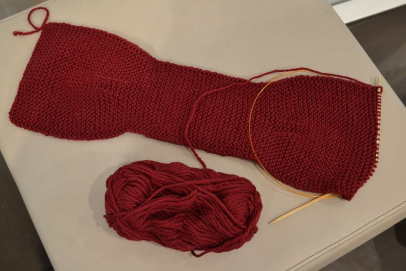 Nu ser stickningen ut såhär (och bilden är tagen inne på en Mc Donald’s-restaurang dit vi gick den kväll när vi hade bråttom – annars åt vi faktiskt alla luncher och middagar på helt kedjelösa restauranger, och det blev inte dyrt, och det var väldigt trevligt!).