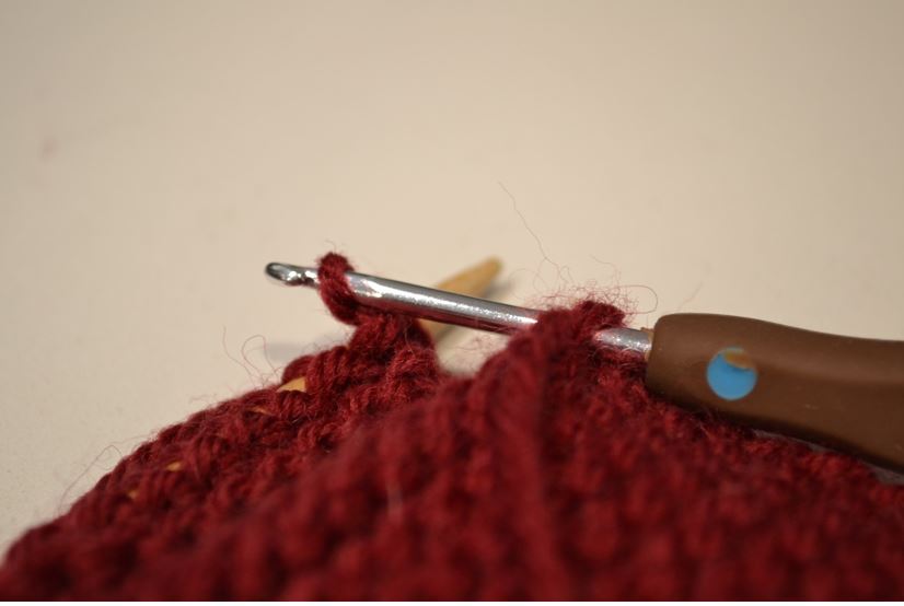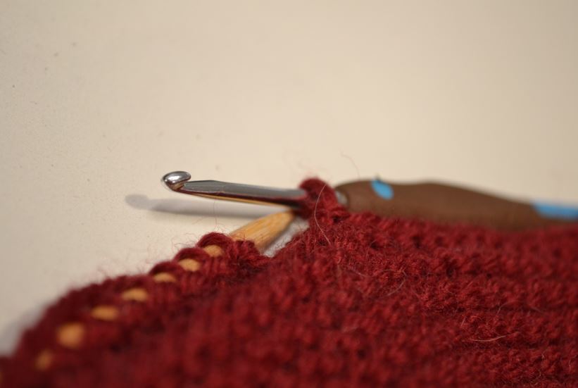 Börja plocka upp maskor, en för varje ”rilla” (två varv), genom båda lagren. Använd virknålen om du vill – annars går det nästan lika lätt med bara stickan.