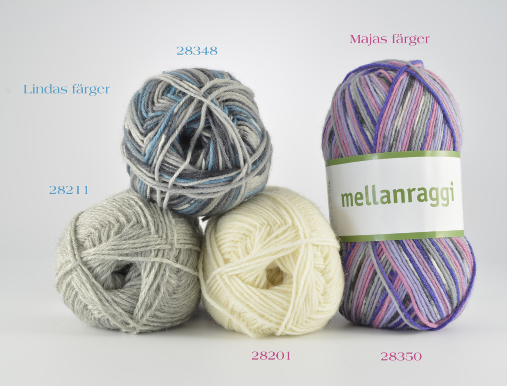 Garn: Mellanraggi (1-6 färger, enfärgat och/eller print). Vi kommer att visa med 1 enfärgad + 1 print.