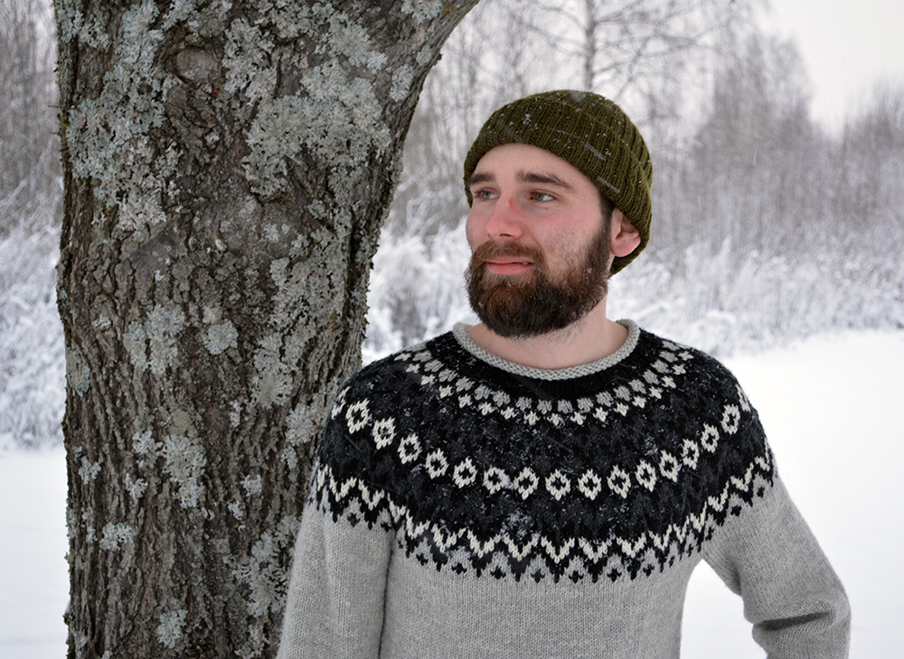 Kalle (som var vänlig nog att ställa upp som modell) skickade garn som i och för sig är mer mörkgrönt än militärgrönt men som min bror godkände, och nu finns det en ny mössa åt min bror, handstickad istället för maskinstickad och rundstickad istället för sydd med overlock. Den är också lite tjockare och fluffigare än originalet, och den har större maskor. Men han sa att han tror att han kan använda den, och hursomhelst innehåller den en lösning som jag är så väldigt nöjd med, så här kommer den!