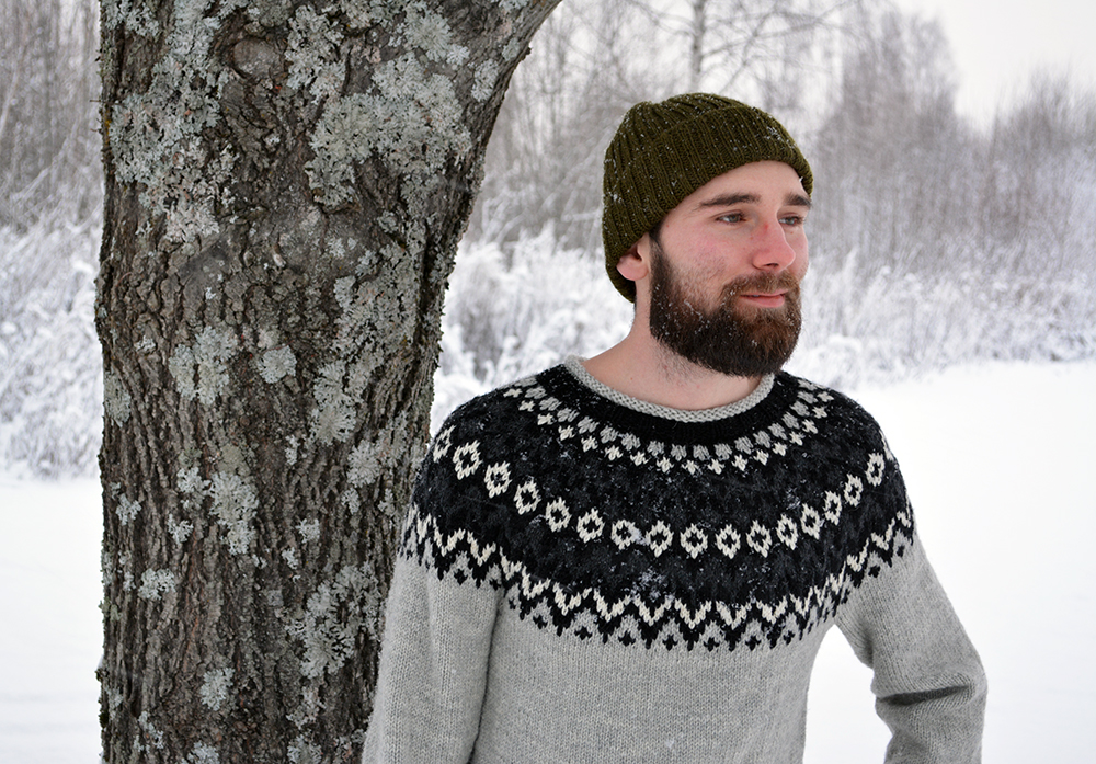 Lägg upp 141 m och börja sticka fram och tillbaka i resår, 2 r, 2 a (på slutet blir det 3 a). Sticka i 3–4 cm – det är inte så noga hur mycket det blir, utan poängen är att du redan har en stadig stickning när du sedan sätter ihop stycket till en rundstickning.