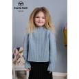 Modern barntröja som kombinerar enkelt strukturstickning över bålen med slätstickade ärmar. Tröjan har mycket vidd och långa, mysiga ärmmuddar som kan vikas upp eller ner. Bålens bakstycke är något längre och har en rundad fåll.