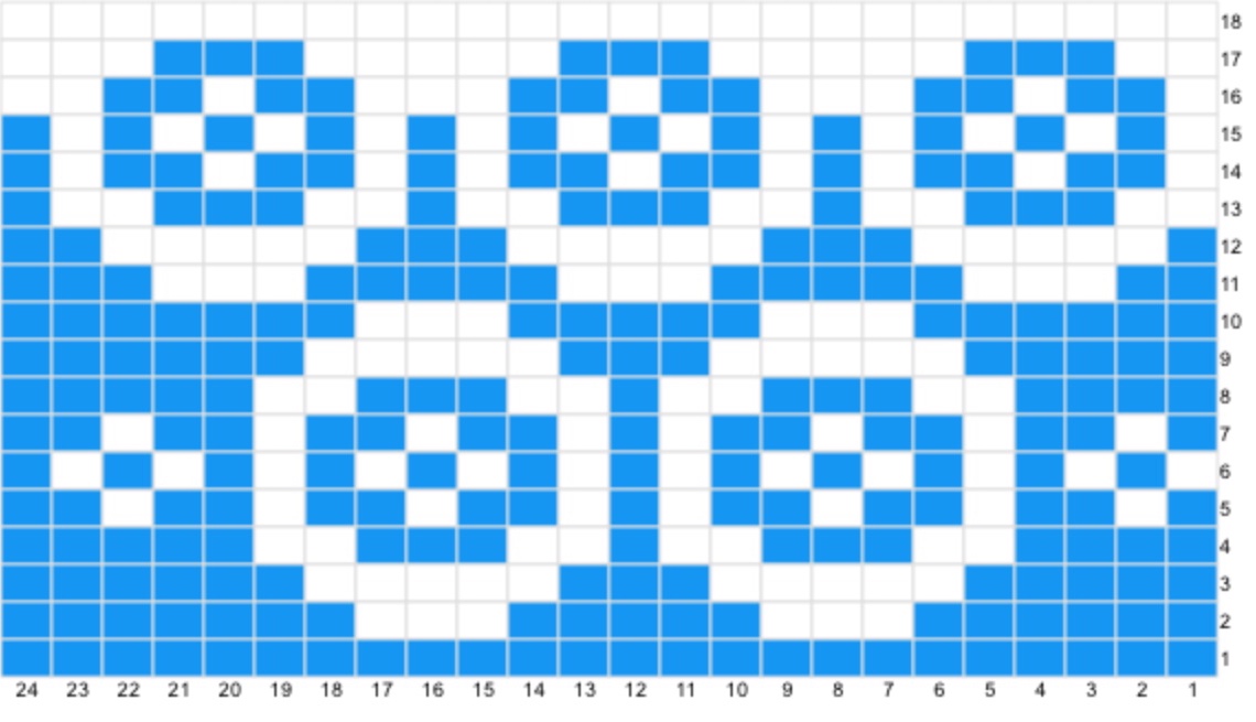 Sticka mönster enligt diagram. (Repetera maska 1-24 varvet runt i 18 varv.)