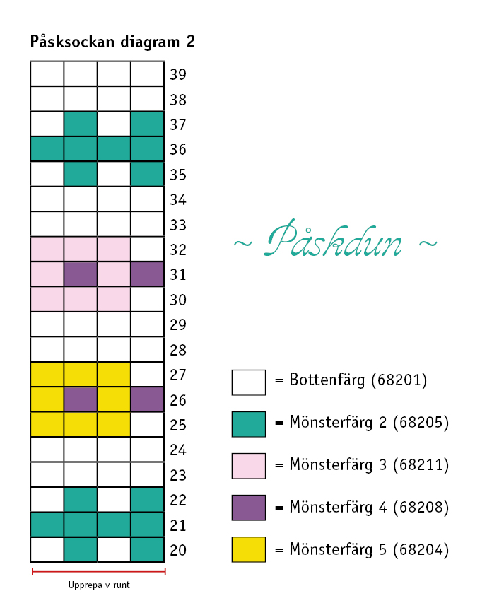 Vi fortsätter med foten och ett mönster som för tankarna till godisägg, blommor och vårdekorationer. Till påsk använder vi ju gärna färgglada dun att pigga upp oss med, så säg hej till ”Påskdun”!